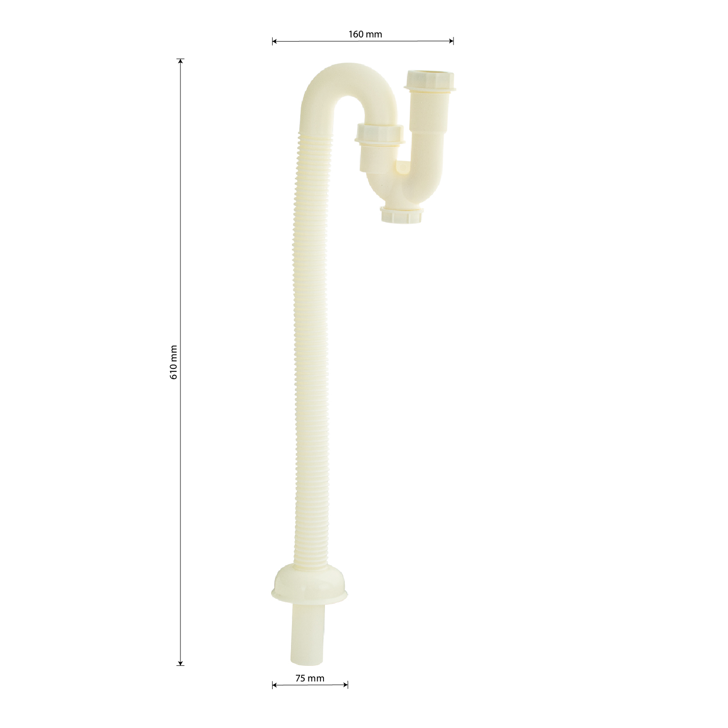 Нижняя часть для всех видов сифонов, из высокопрочного пластика АБС белого цвета предназначена для слива воды из мойки или раковины. Она герметично соединяет раковину с канализационной сетью. Гофрированный сифон и изгиб блокирует неприятные запахи из канализации. В трубе всегда есть небольшое количество воды, которая и предотвращает появление неприятных запахов. Регулируемая длина гофры позволяет установить раковину на нужном расстоянии от канализации. Качественный водопровод — залог чистоты в ванной комнате. Габаритные размеры: высота 610 мм, ширина 160 мм. Вес - 0,200 кг, объём - 0,00226 м3.