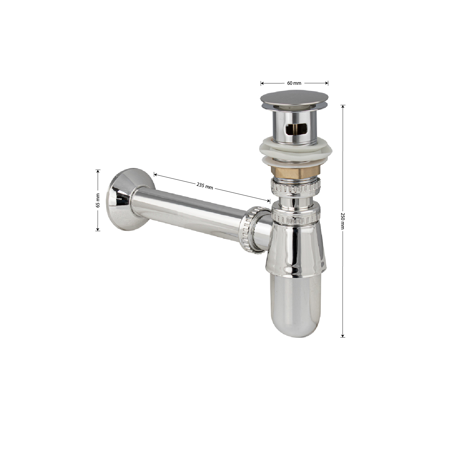 Сифон для раковины из высокопрочного АБС пластика, хромированный, с системой "Клик-Клак" это эстетичное и функциональное устройство для подключения раковины к системе канализации. Бутылочная модель изготовлена из пластика, что обуславливает ее высокую прочность и долговечность. Она устойчива к перепаду температур, поэтому в раковину можно сливать кипяток. Хромированная поверхность сохраняет зеркальный блеск даже после длительной эксплуатации, поверхность не требует особого ухода – достаточно просто протереть. Изделие комплектуется гофрированной трубой с выходом для канализации 50 мм. Габаритные размеры: высота 250 мм, длина 235 мм, диаметр 60 мм. Вес - 0,4 кг, объём - 0,00176 м3