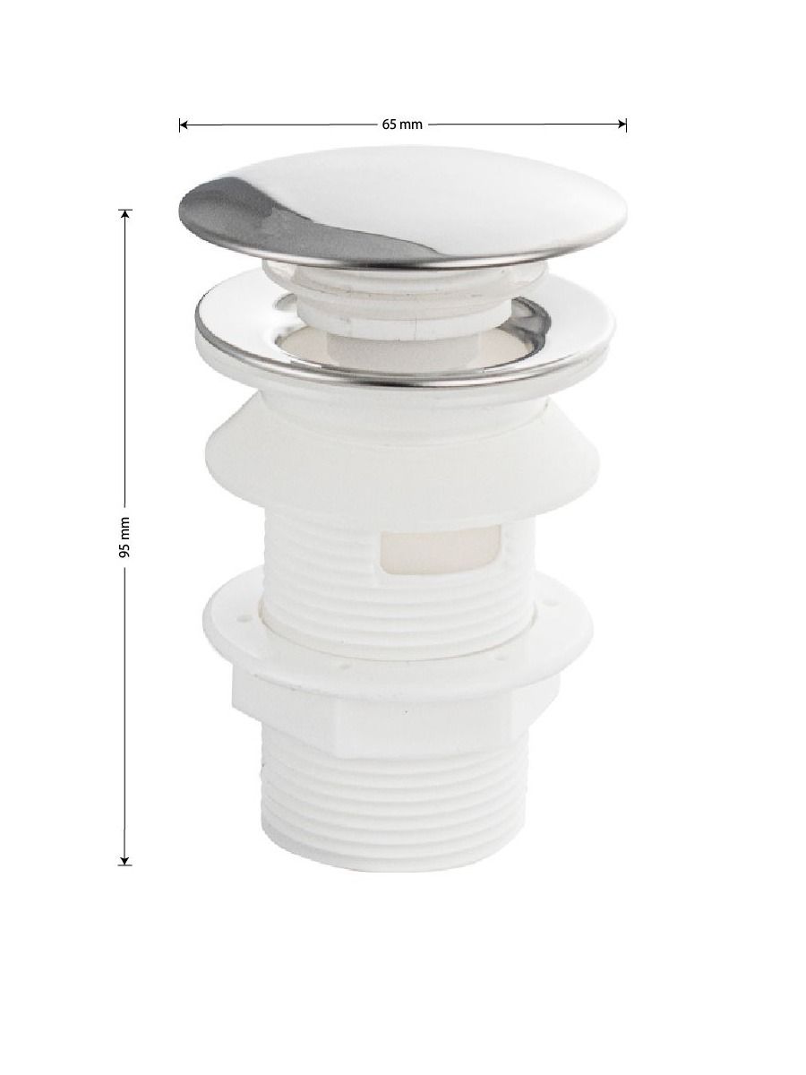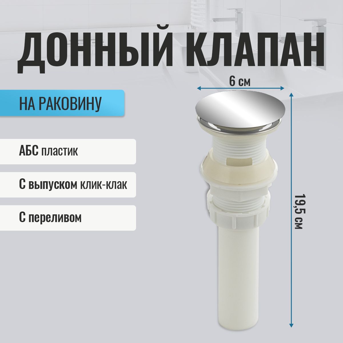 Донный клапан с переливом представляет собой несложный механизм, который устанавливается непосредственно в сливное отверстие раковины и работает как пробка, с системой “Клик-Клак” 1 ¼' и с большой заглушкой клапан надежно закроет сливное отверстие раковины. Нужно использовать для умывальников с переливом. Изготовлено из высокопрочного пластика АБС с хромированной заглушкой. Габаритные размеры: высота 200 мм, диаметр 65 мм. Вес - 0,200 кг, объём - 0,00125 м3.