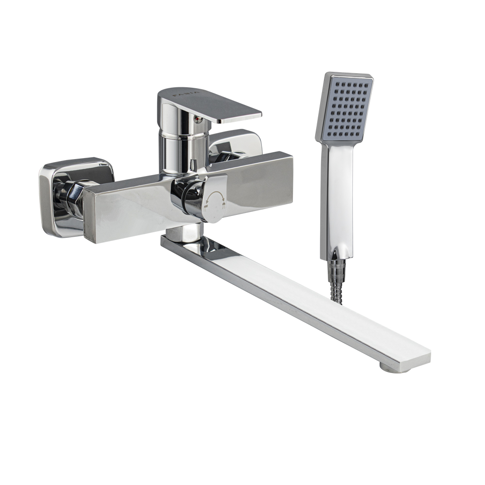 Смеситель хромированный в ванную / душевую комнату с длинным, плоским изливом, тяжёлый, массивный квадратный корпус, шаровый, с дивертором м/к на корпусе. Материал изготовления — ЦАМ (цинк-алюминий-медь) + нержавеющая сталь. Картридж d = мм, литая ручка, аэратор для экономии воды, чашки и эксцентрики из нержавеющей стали. Габаритные размеры: ширина 150 мм, высота корпуса 105 мм, длина излива 300 мм, душевая лейка 210 мм, шланг 150 см. Вес - 1,9 кг, объём - 0,00508 м3. В комплекте паспорт, корпус с изливом, дивертор, душевая лейка, шланг, кронштейн, комплект крепежа и прокладок.