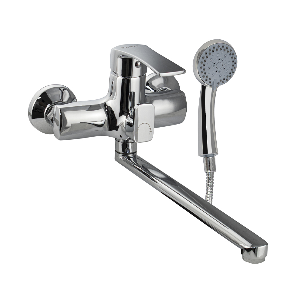 Смеситель хромированный в ванную / душевую комнату с длинным, плоским изливом, тяжёлый, массивный корпус, шаровый, с дивертором м/к на корпусе. Материал изготовления — ЦАМ (цинк-алюминий-медь) + нержавеющая сталь. Картридж d = мм, литая ручка, аэратор для экономии воды, чашки и эксцентрики из нержавеющей стали. Габаритные размеры: ширина 150 мм, высота корпуса 160 мм, длина излива 300 мм, душевая лейка 75 мм, шланг 150 см. Вес - 1.8 кг, объём - 0.0050 м3. В комплекте паспорт, корпус с изливом, дивертор, душевая лейка, шланг, кронштейн, комплект крепежа и прокладок.