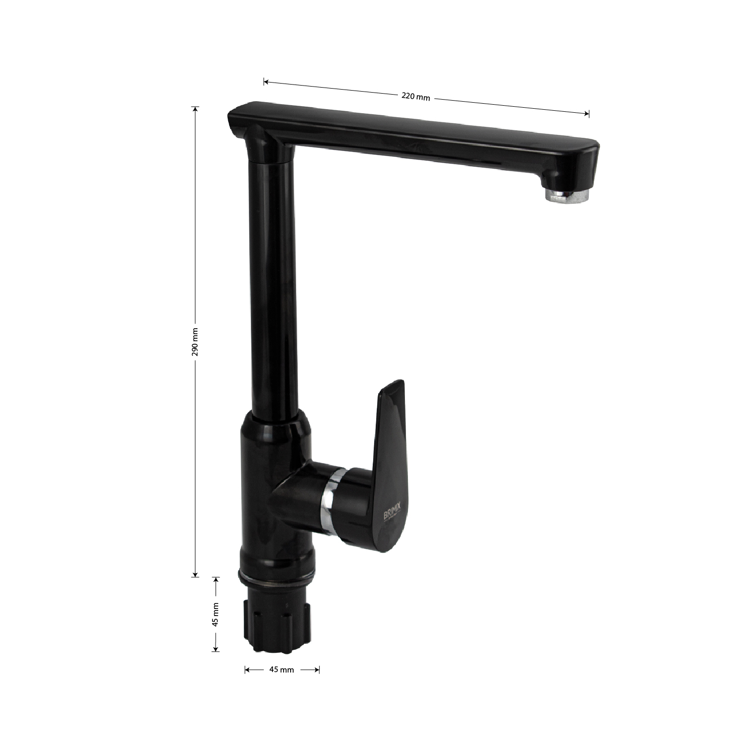 Смеситель для кухонной мойки и раковин, из высокопрочного пластика АБС, ЧЁРНЫЙ, боковой, с высоким Г-образным изливом, шаровый. Крепление резьба - гайка, картридж d = 40 мм, литая хромированная ручка. Хромированный аэратор для экономии воды. Габаритные размеры: высота 290 мм, длина 220 мм, диаметр посадочного седла 45 мм, длина резьбы 45 мм, длина подводки 450 мм. Вес - 0,730 кг, объём - 0,00550 м3. В комплекте паспорт, корпус с изливом, пластиковая подводка с латунными штуцерами 1/2, крепеж, набор прокладок.