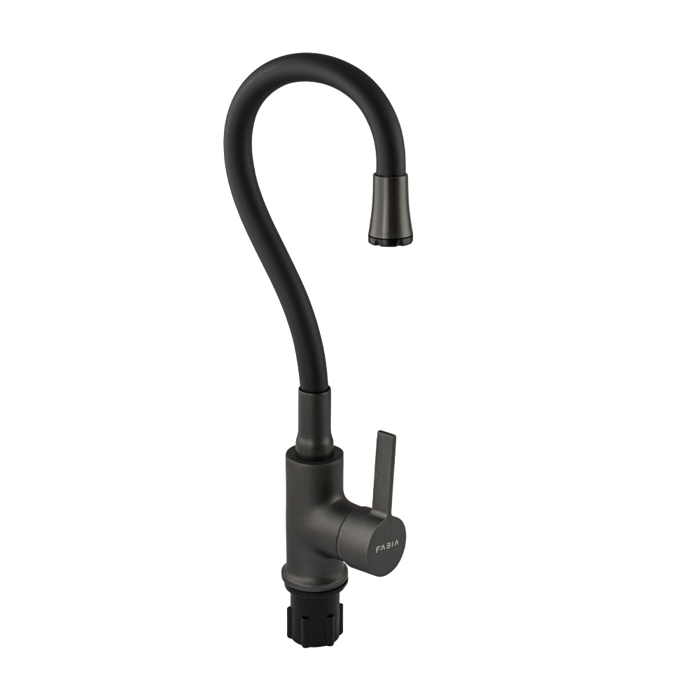 Смеситель для кухонной мойки и раковин, литой корпус цвет графит, с высоким гибким изливом черного цвета, с аэратором для экономии воды, шаровый. Материал изготовления — ЦАМ (цинк-алюминий-медь) + нержавеющая сталь. Крепление резьба - гайка, картридж d = 35 мм, ручка литая. Такая модель может использоваться на домашней кухне, на даче, в медицинских учреждениях и общественных местах. Габаритные размеры: высота 340-400 мм, длина 50-250 мм, диаметр посадочного седла 45 мм, длина резьбы 50 мм, длина подводки 400 мм. Вес - 1,350 кг, объём - 0,00403 м3. В комплекте паспорт, корпус с изливом, подводка 1/16, крепеж, набор прокладок.