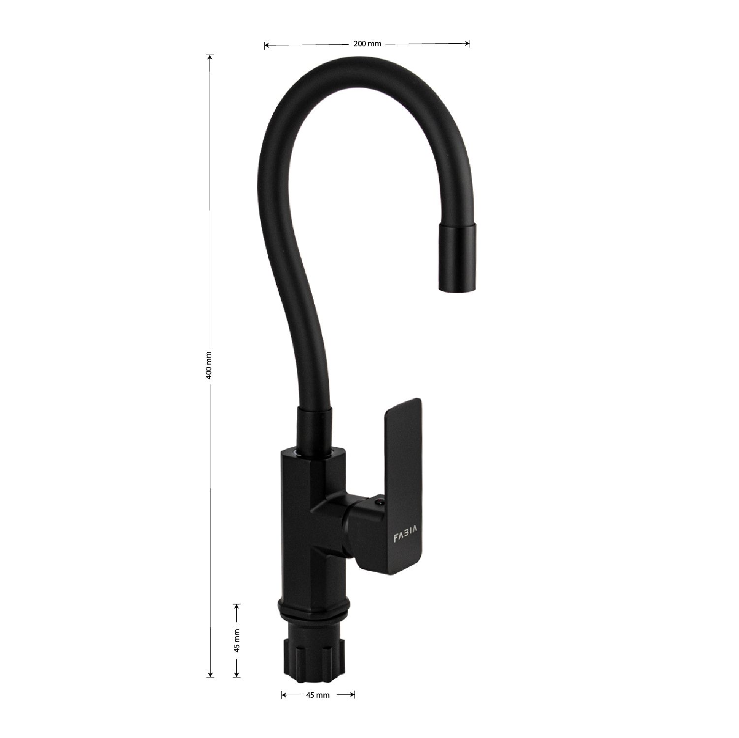 Смеситель для кухонной мойки и раковин, черный, боковой, шаровый d = мм, массивный корпус с гибким изливом чёрного цвета, с аэратором для экономии воды. Материал изготовления — ЦАМ (цинк-алюминий-медь). Крепление резьба - гайка, литая ручка. Вес - 1.5 кг, объём - 0.00585 м3. В комплекте корпус с изливом, паспорт, подводка 1/2, крепёж. Габаритные размеры коробки: ширина 200 мм, высота 400 мм, высота резьбы 45 мм, диаметр посадочного седла 45 мм.