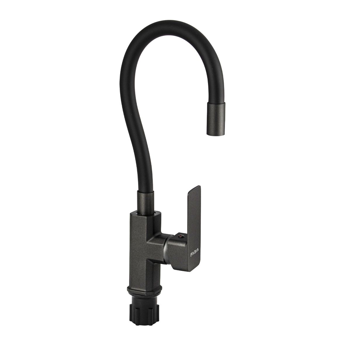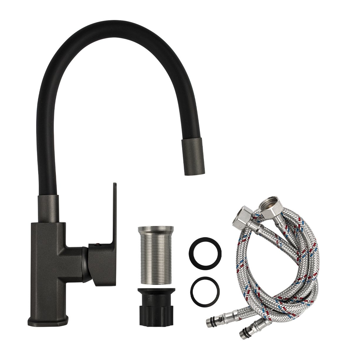 Смеситель для кухонной мойки и раковин, цвет корпуса графит, боковой, шаровый d = мм, массивный корпус с гибким изливом чёрного цвета, с аэратором для экономии воды. Материал изготовления — ЦАМ (цинк-алюминий-медь). Крепление резьба - гайка, литая ручка. Вес - 1.5 кг, объём - 0.00585 м3. В комплекте корпус с изливом, паспорт, подводка 1/2, крепёж. Габаритные размеры коробки: ширина 200 мм, высота 400 мм, высота резьбы 45 мм, диаметр посадочного седла 45 мм.