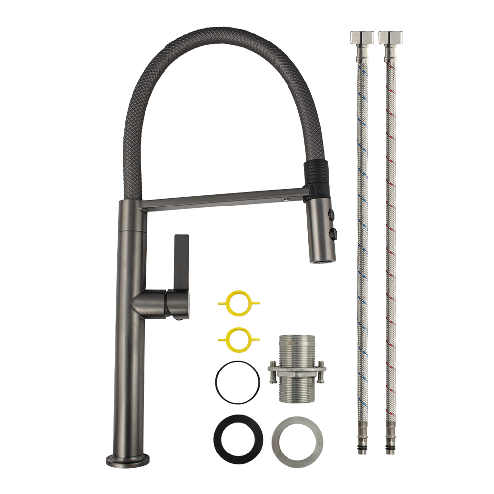 Смеситель для кухонной мойки с гибким серым рельефным изливом с магнитной фиксацией, двухрежимный аэратор, литой корпус цвета графит, из нержавеющей стали марка SUS 304. Крепление резьба - гайка, картридж d = мм, ручка шток. Аэратор для экономии воды. Такая модель может использоваться на домашней кухне, на даче, в медицинских учреждениях и общественных местах. Габаритные размеры: высота 530 мм, длина 260 мм, диаметр посадочного седла 50 мм, длина резьбы 60 мм, длина подводки 500 мм. Вес - 2.28 кг, объём - 0.01092 м3. В комплекте паспорт, корпус с изливом, подводка 1/2, крепеж, набор прокладок.