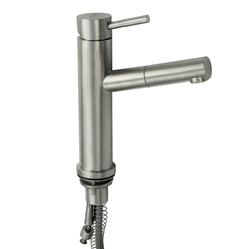 Смеситель для кухонной мойки и раковин, вытяжной излив - лейка, литой матовый корпус, из нержавеющей стали марки 304, шаровый. Крепление резьба - гайка, картридж d = 35 мм, ручка шток. Аэратор для экономии воды. Такая модель может использоваться на домашней кухне, на даче, в медицинских учреждениях и общественных местах Габаритные размеры: высота 210 мм, длина 170 мм, длина излива 140 мм, диаметр посадочного седла 55 мм, длина резьбы 40 мм, длина подводки 500 мм, длина шланга 100 см. Вес - 1,700 кг, объём - 0,00577 м3. В комплекте паспорт, корпус с изливом, подводка 1/2, крепеж, набор прокладок.