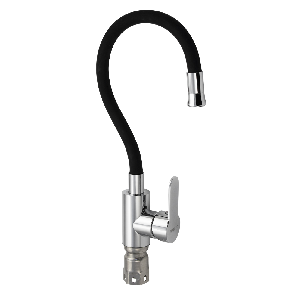 Смеситель для кухонной мойки и раковин, литой хромированный корпус, из нержавеющей стали марки 304, с высоким гибким изливом чёрного цвета, с аэратором для экономии воды, шаровый. Крепление резьба - гайка, картридж d = 35 мм, ручка литая. Такая модель может использоваться на домашней кухне, на даче, в медицинских учреждениях и общественных местах. Габаритные размеры: высота 280 - 380 мм, длина 200 - 310 мм, диаметр посадочного седла 43 мм, длина резьбы 60 мм, длина подводки 400 мм. Вес - 1,862 кг, объём - 0,00647 м3. В комплекте паспорт, корпус с изливом, подводка 1/2, крепеж, набор прокладок.