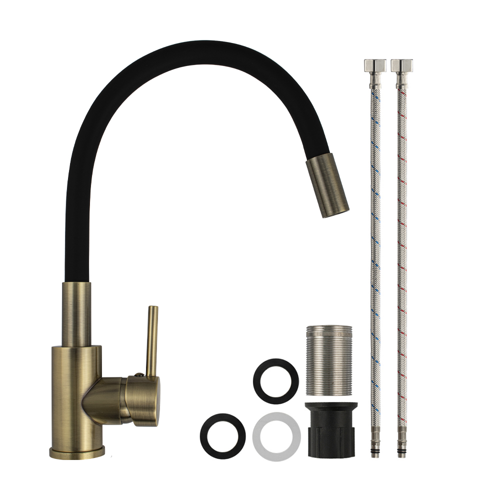Смеситель для кухонной мойки и раковин, литой корпус, из нержавеющей стали марки 304, с высоким гибким изливом чёрного цвета, с аэратором для экономии воды, шаровый, цвет бронза. Крепление резьба - гайка, картридж d = 35 мм, ручка литая. Такая модель может использоваться на домашней кухне, на даче, в медицинских учреждениях и общественных местах. Габаритные размеры: высота до 350 мм, длина до 250 мм, диаметр посадочного седла 45 мм, длина резьбы 55 мм, длина подводки 450 мм. Вес - 1,8 кг, объём - 0,0042 м3. В комплекте паспорт, корпус с изливом, подводка 1/2, крепеж, набор прокладок.