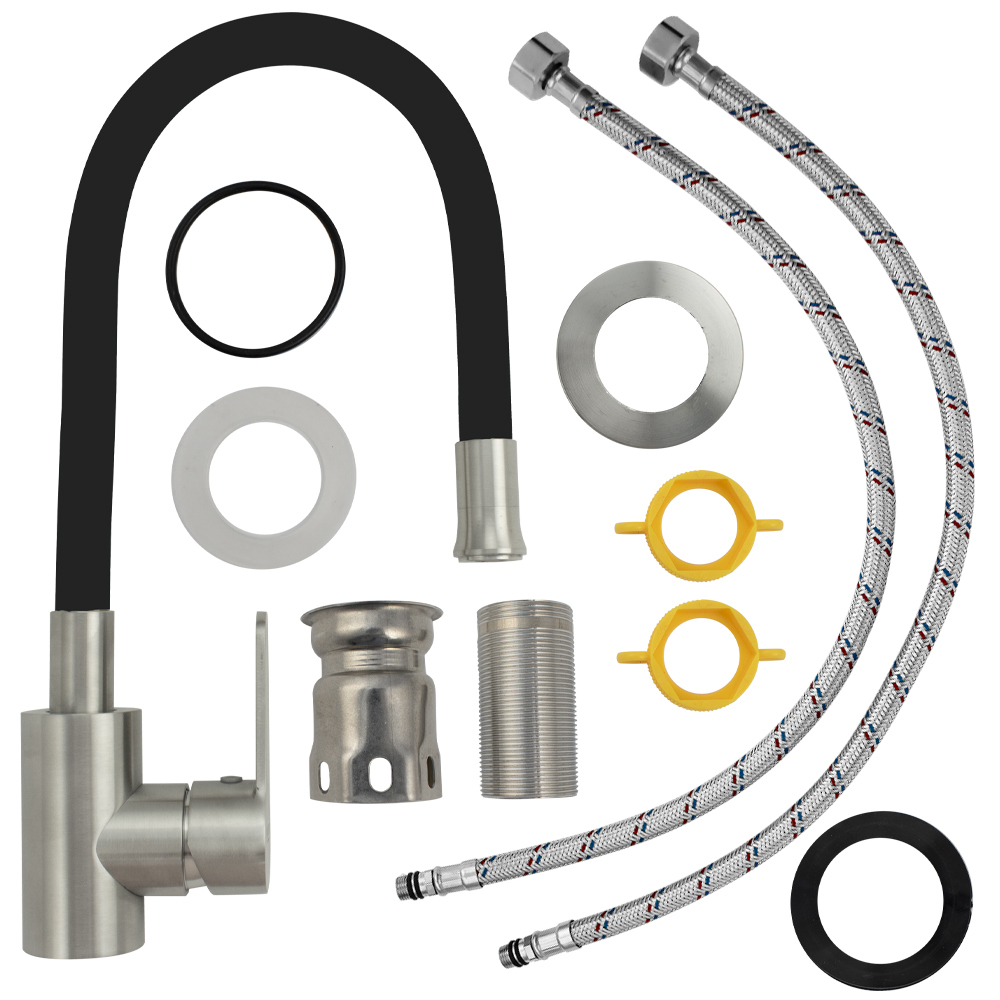 Смеситель для кухонной мойки и раковин, литой матовый корпус, из нержавеющей стали марки 304, с высоким гибким изливом чёрного цвета, с аэратором для экономии воды, шаровый. Крепление резьба - гайка, картридж d = 35 мм, ручка литая. Такая модель может использоваться на домашней кухне, на даче, в медицинских учреждениях и общественных местах. Габаритные размеры: высота до 400 мм, длина до 300 мм, диаметр посадочного седла 45 мм, длина резьбы 65 мм, длина подводки 400 мм. Вес - 2,000 кг, объём - 0,00421 м3. В комплекте паспорт, корпус с изливом, подводка 1/2, крепеж, набор прокладок.