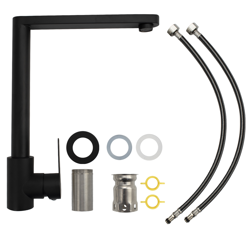 Смеситель для кухонной мойки и раковин, цвет ЧЁРНЫЙ, литой корпус, из нержавеющей стали марки 304, с высоким литым Г-образным изливом, шаровый. Крепление резьба - гайка, картридж d = 35 мм, ручка литая. Аэратор для экономии воды. Такая модель может использоваться на домашней кухне, на даче, в медицинских учреждениях и общественных местах. Габаритные размеры: высота 310 мм, длина 240 мм, диаметр посадочного седла 50 мм, длина резьбы 60 мм, длина подводки 450 мм. Вес - 1,600 кг, объём - 0,00647 м3. В комплекте паспорт, корпус с изливом, подводка 1/2, крепеж, набор прокладок.