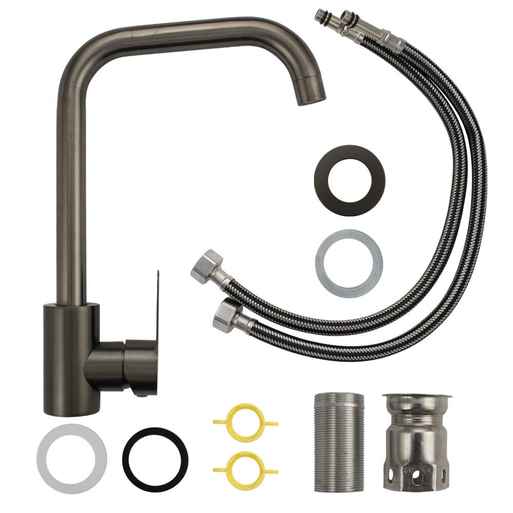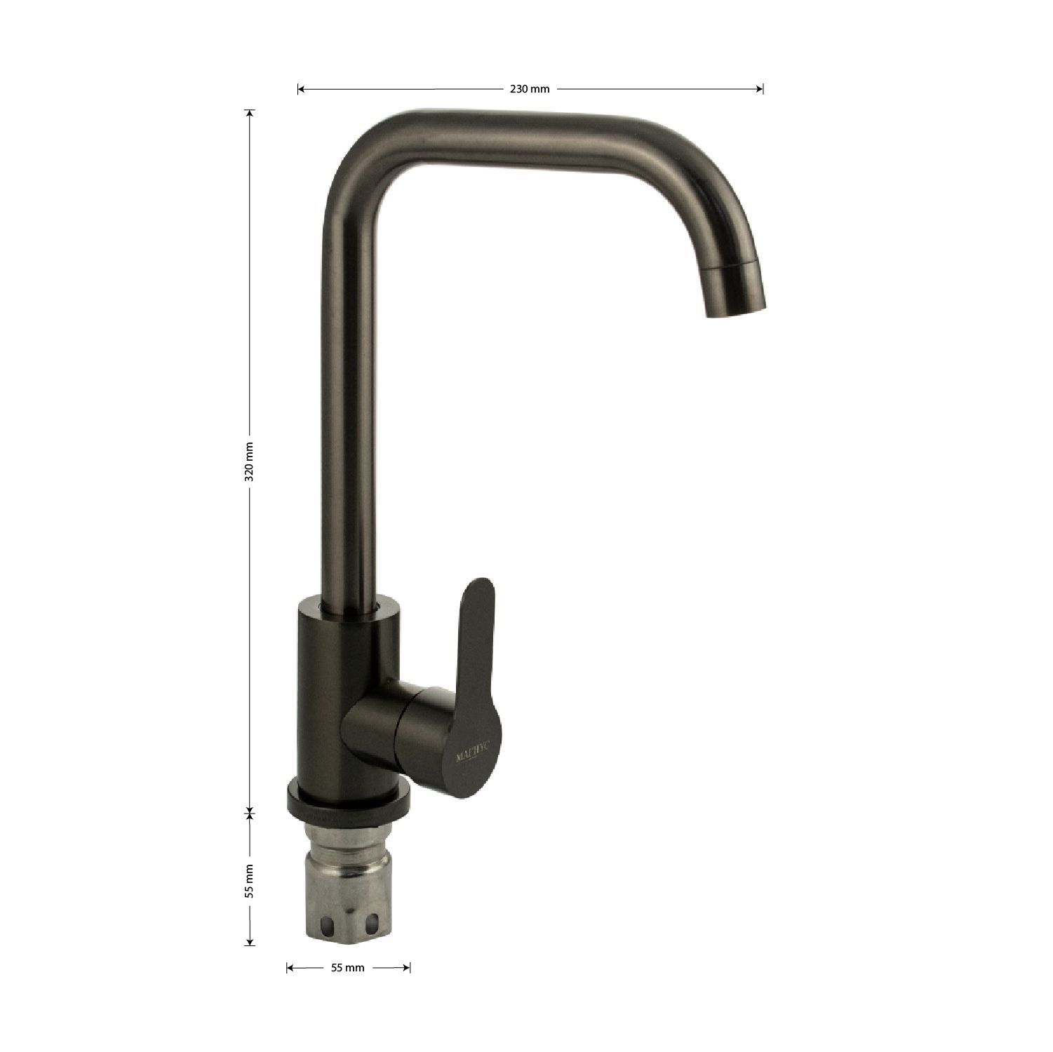 Смеситель для кухонной мойки и раковин, литой матовый корпус графитового цвета, из нержавеющей стали марки 304, с высоким П-образным изливом, шаровый. Крепление резьба - гайка, картридж d = 35 мм, ручка литая. Аэратор для экономии воды. Такая модель может использоваться на домашней кухне, на даче, в медицинских учреждениях и общественных местах. Габаритные размеры: высота 320 мм, длина 230 мм, диаметр посадочного седла 55 мм, длина резьбы 55 мм, длина подводки 450 мм. Вес - 1,4 кг, объём - 0,00490 м3. В комплекте паспорт, корпус с изливом, подводка 1/2, крепеж, набор прокладок