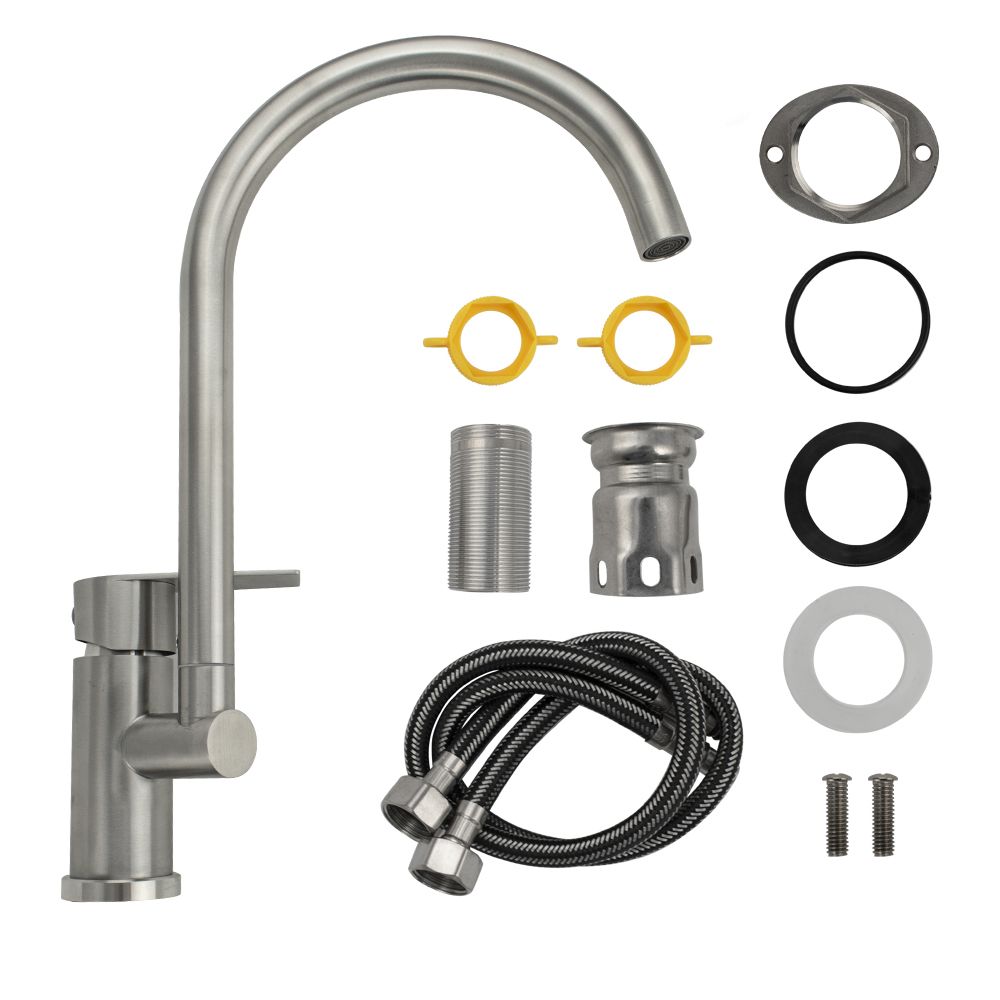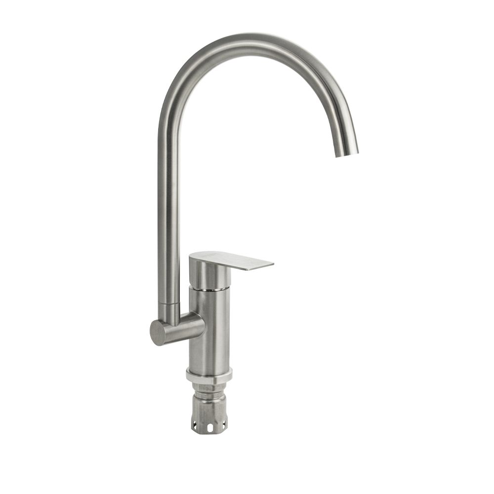 Смеситель для кухонной мойки и раковин, литой матовый корпус, из нержавеющей стали марки 304, с высоким С-образным изливом, шаровый. Крепление резьба - гайка, картридж d = 40 мм, ручка литая. Аэратор для экономии воды. Такая модель может использоваться на домашней кухне, на даче, в медицинских учреждениях и общественных местах. Габаритные размеры: высота 380 мм, длина 230 мм, диаметр посадочного седла 50 мм, длина резьбы 60 мм, длина подводки 500 мм. Вес - 1,400 кг, объём - 0,00900 м3. В комплекте паспорт, корпус с изливом, подводка 1/2, крепеж, набор прокладок.