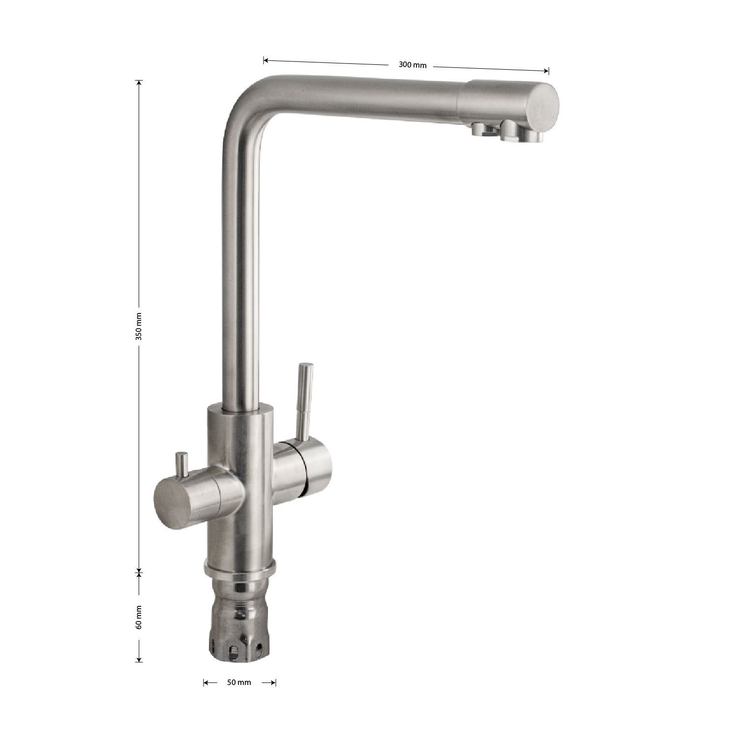 Смеситель для кухонной мойки и раковин с двойным выпуском воды для фильтра, литой матовый корпус, из нержавеющей стали марка 304, с высоким Г - образным изливом, шаровый. Крепление резьба - гайка, картридж d = 40 мм, ручка шток. Аэратор для экономии воды. Такая модель может использоваться на домашней кухне, на даче, в медицинских учреждениях и общественных местах. Габаритные размеры: высота 350 мм, длина 300 мм, диаметр посадочного седла 50 мм, длина резьбы 60 мм, длина подводки 500 мм. Вес - 2,400 кг, объём - 0,00900 м3. В комплекте паспорт, корпус с изливом, подводка 1/2, крепеж, набор прокладок