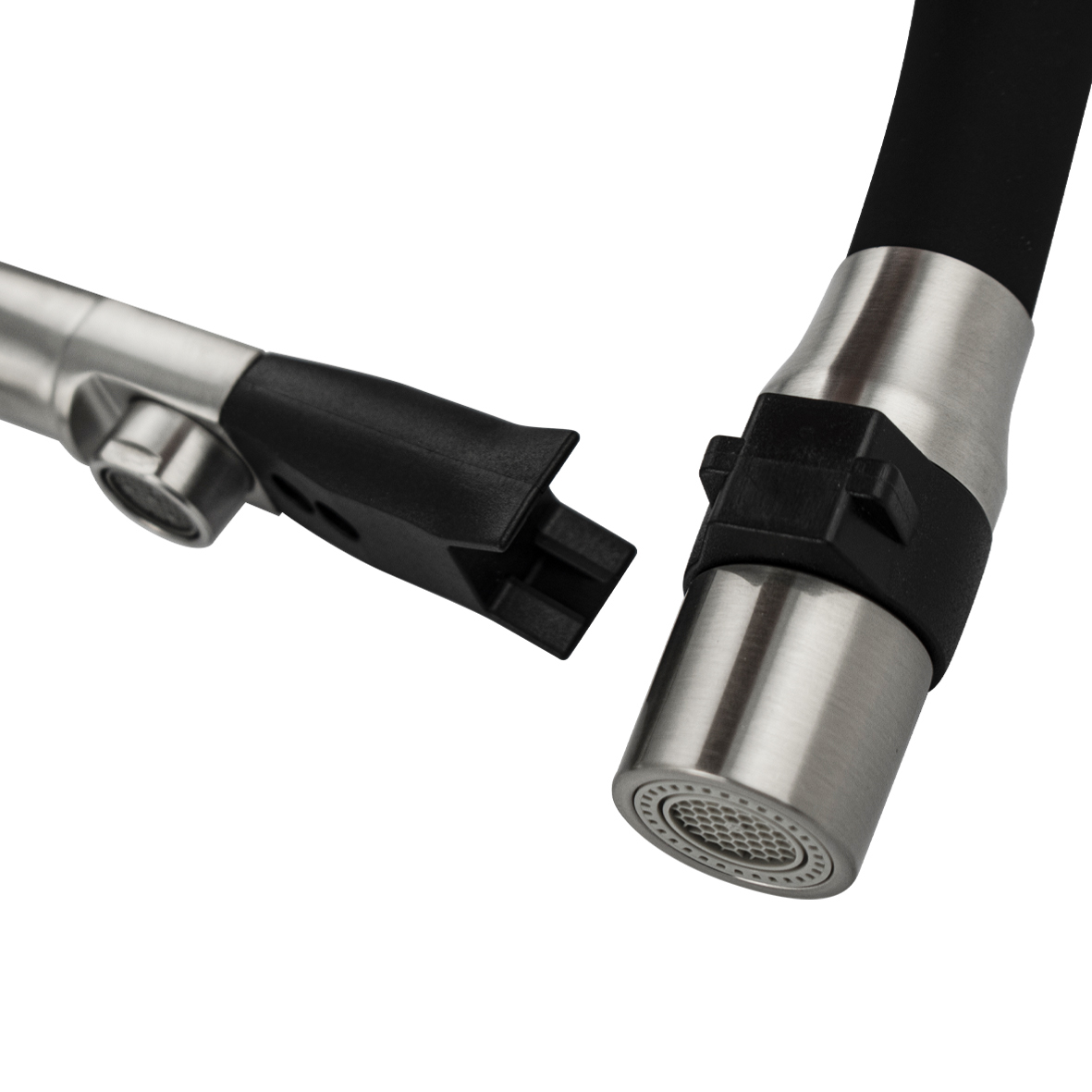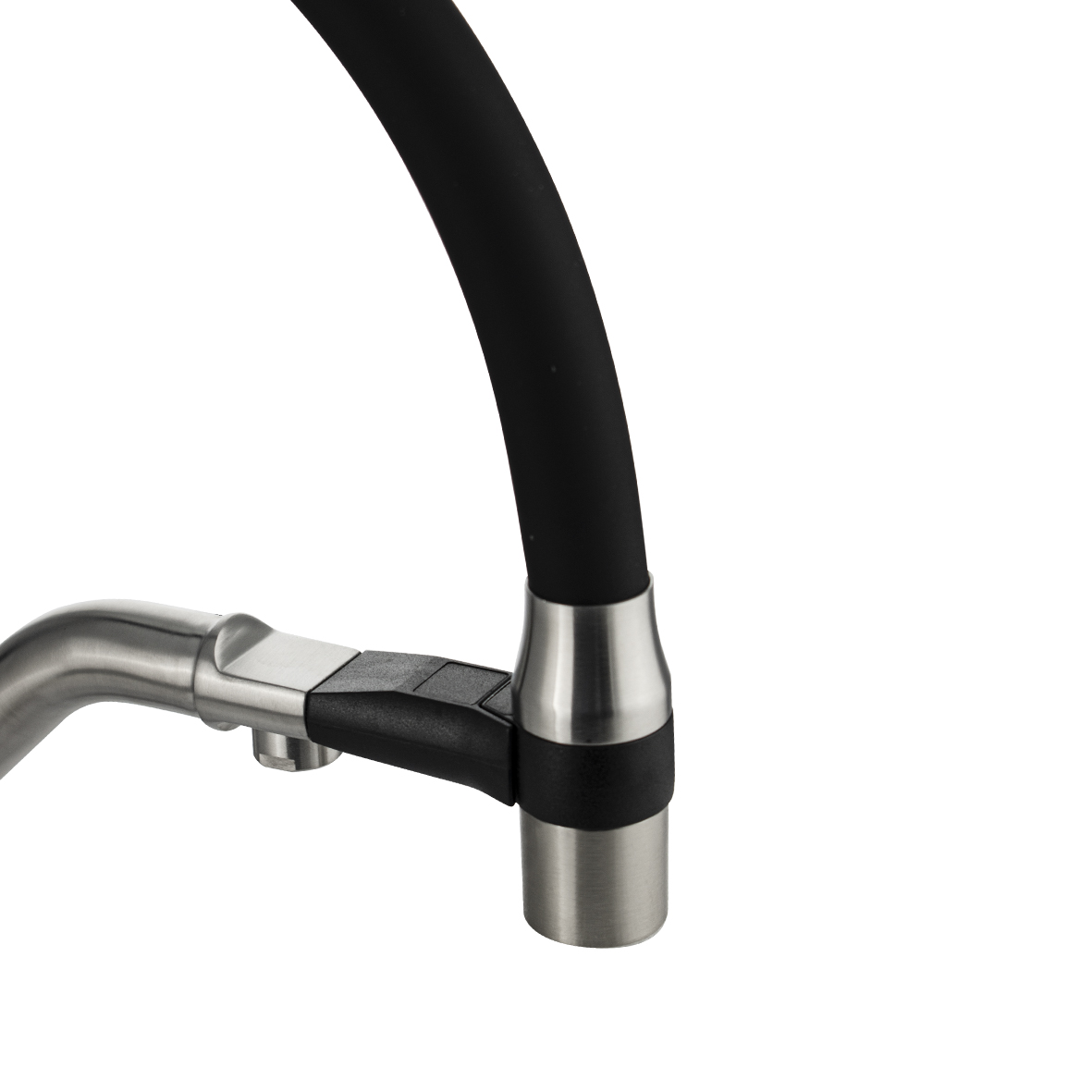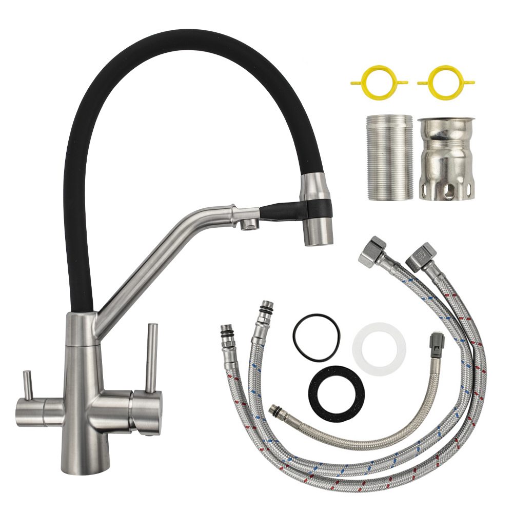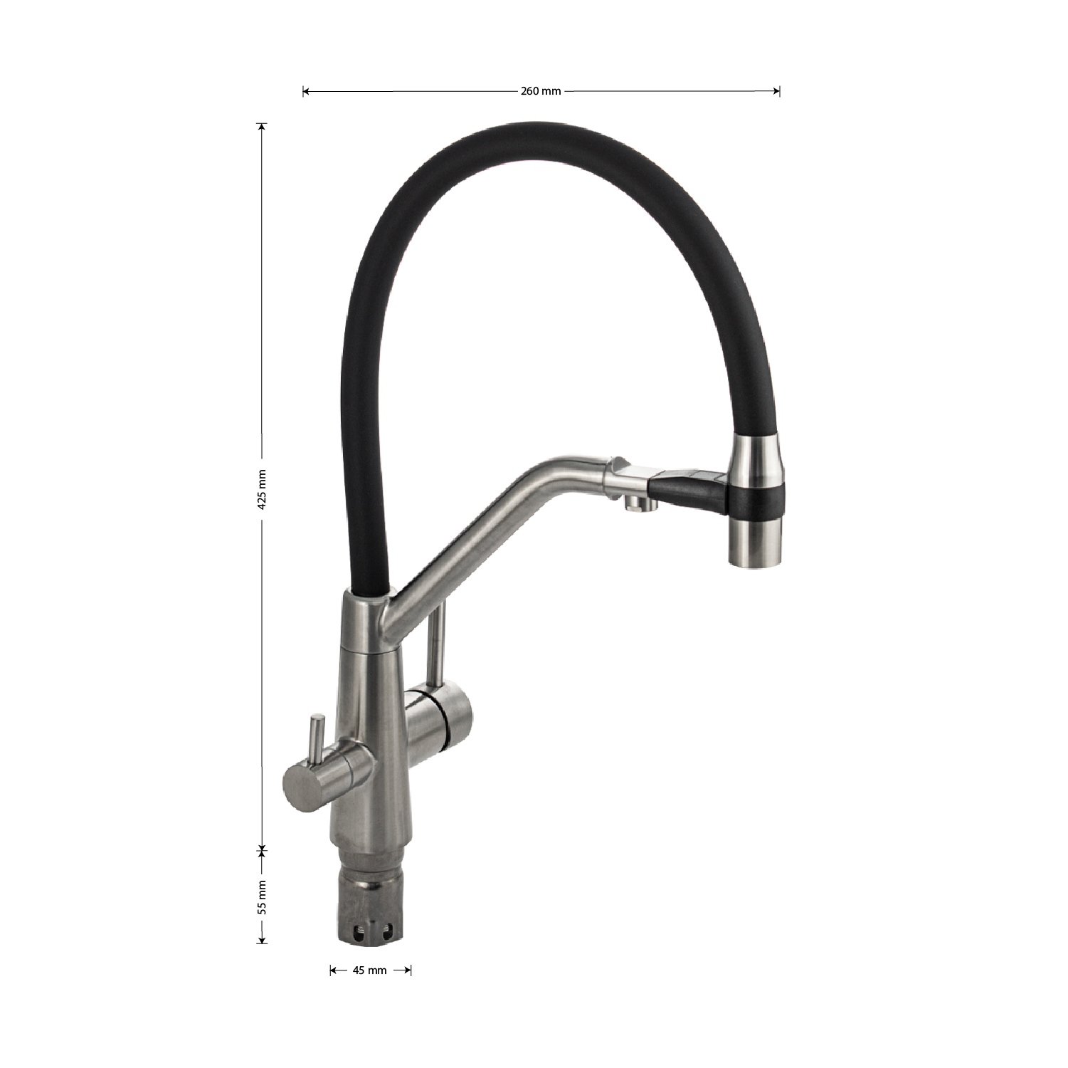 Смеситель для кухонной мойки и раковин с двойным выпуском воды для фильтра, литой матовый корпус, из нержавеющей стали марка 304, с высоким С-образным гибким изливом чёрного цвета с магнитной фиксацией на жёстком изливе, шаровый. Крепление резьба - гайка, картридж d = 40 мм, ручка шток. Аэратор для экономии воды. Такая модель может использоваться на домашней кухне, на даче, в медицинских учреждениях и общественных местах. Габаритные размеры: высота 425 мм, длина 260 мм, диаметр посадочного седла 45 мм, длина резьбы 55 мм, длина подводки 500 мм. Вес - 2,570 кг, объём - 0,013 м3. В комплекте паспорт, корпус с изливом, подводка 1/2, крепеж, набор прокладок.