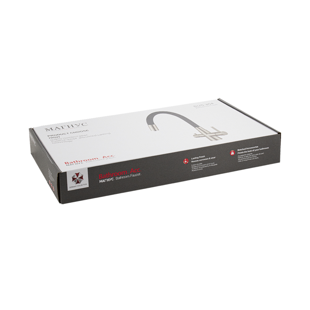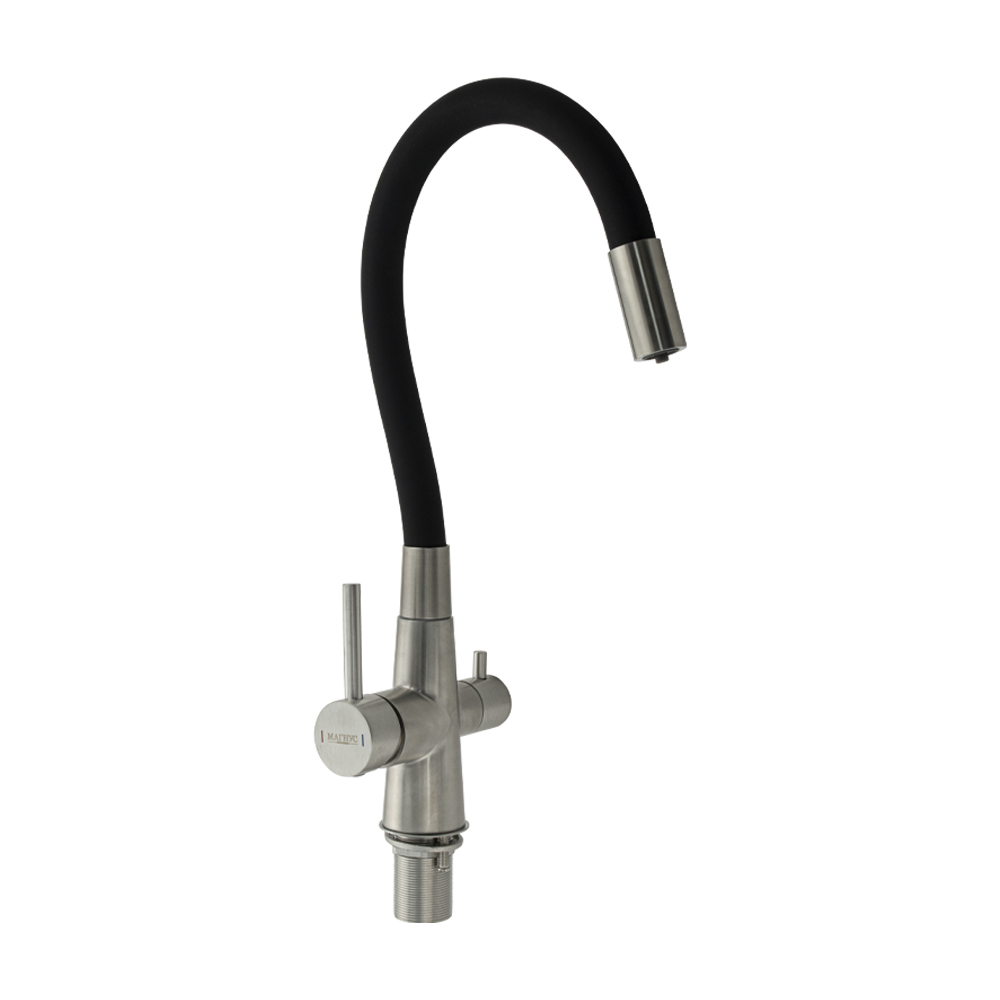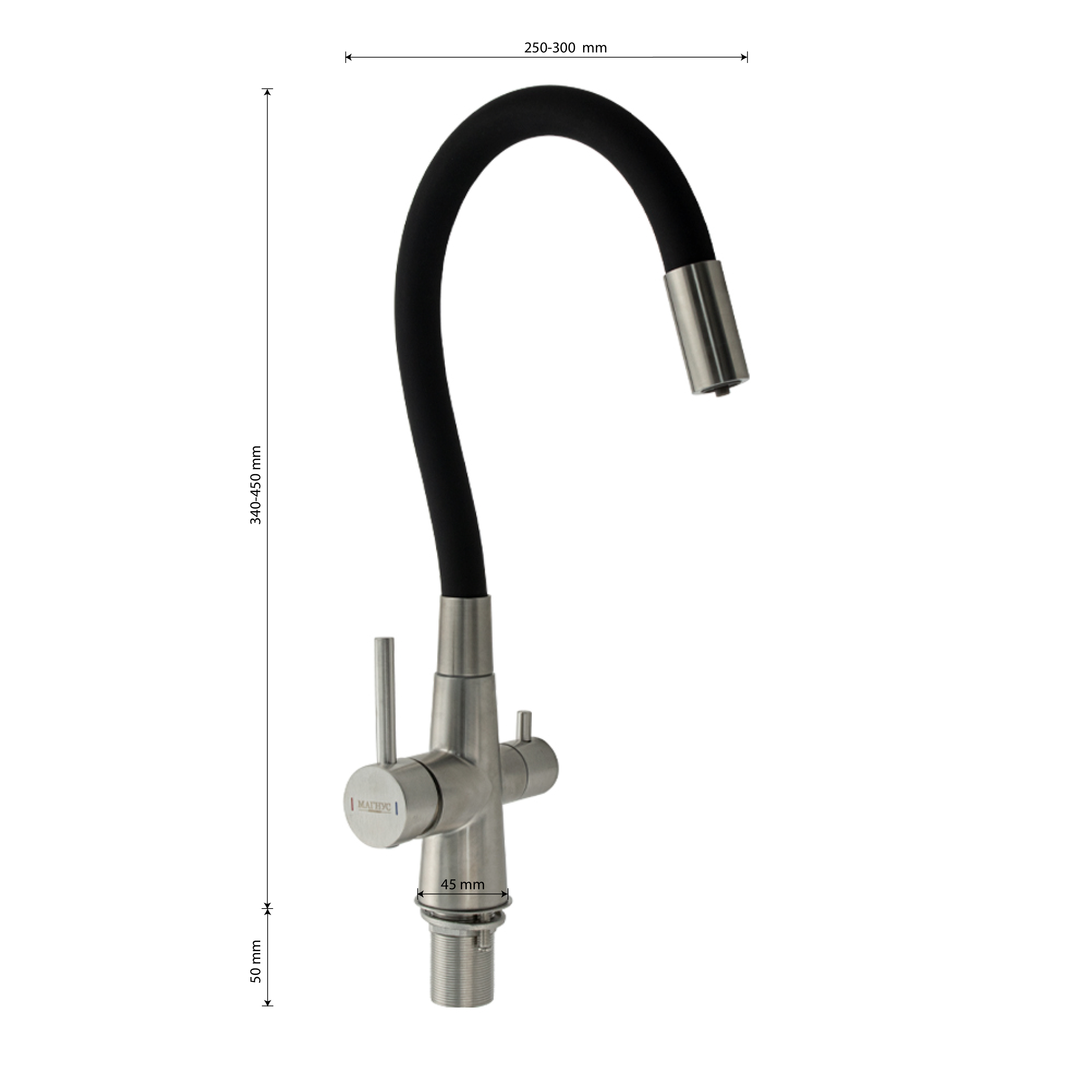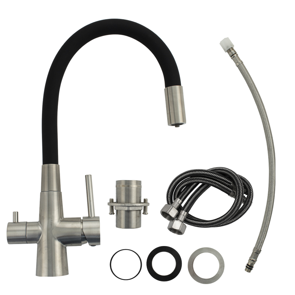 Смеситель для кухонной мойки и раковин с двойным выпуском воды для фильтра, литой матовый корпус, из нержавеющей стали марки 304, с высоким С-образным гибким изливом чёрного цвета, шаровый. Крепление резьба - гайка, картридж d = 40 мм, ручка шток. Аэратор для экономии воды. Такая модель может использоваться на домашней кухне, на даче, в медицинских учреждениях и общественных местах. Габаритные размеры: высота 340 - 450 мм, длина 250 - 300 мм, диаметр посадочного седла 45 мм, длина резьбы 50 мм, длина подводки 450 мм. Вес - 2,450 кг, объём - 0,00700 м3. В комплекте паспорт, корпус с изливом, подводка 1/2, крепеж, набор прокладок.