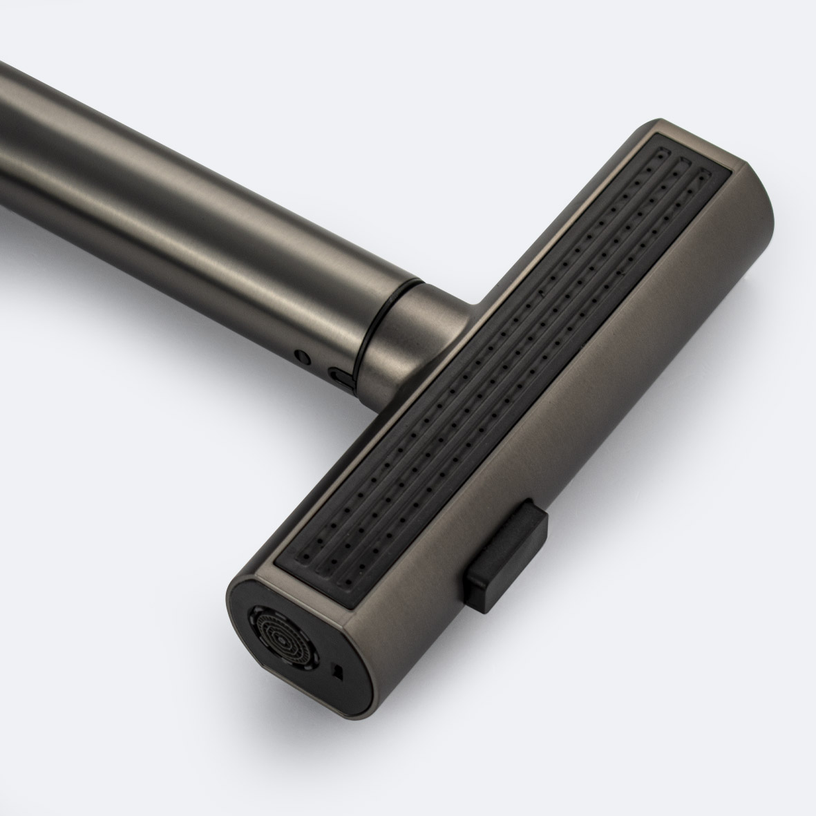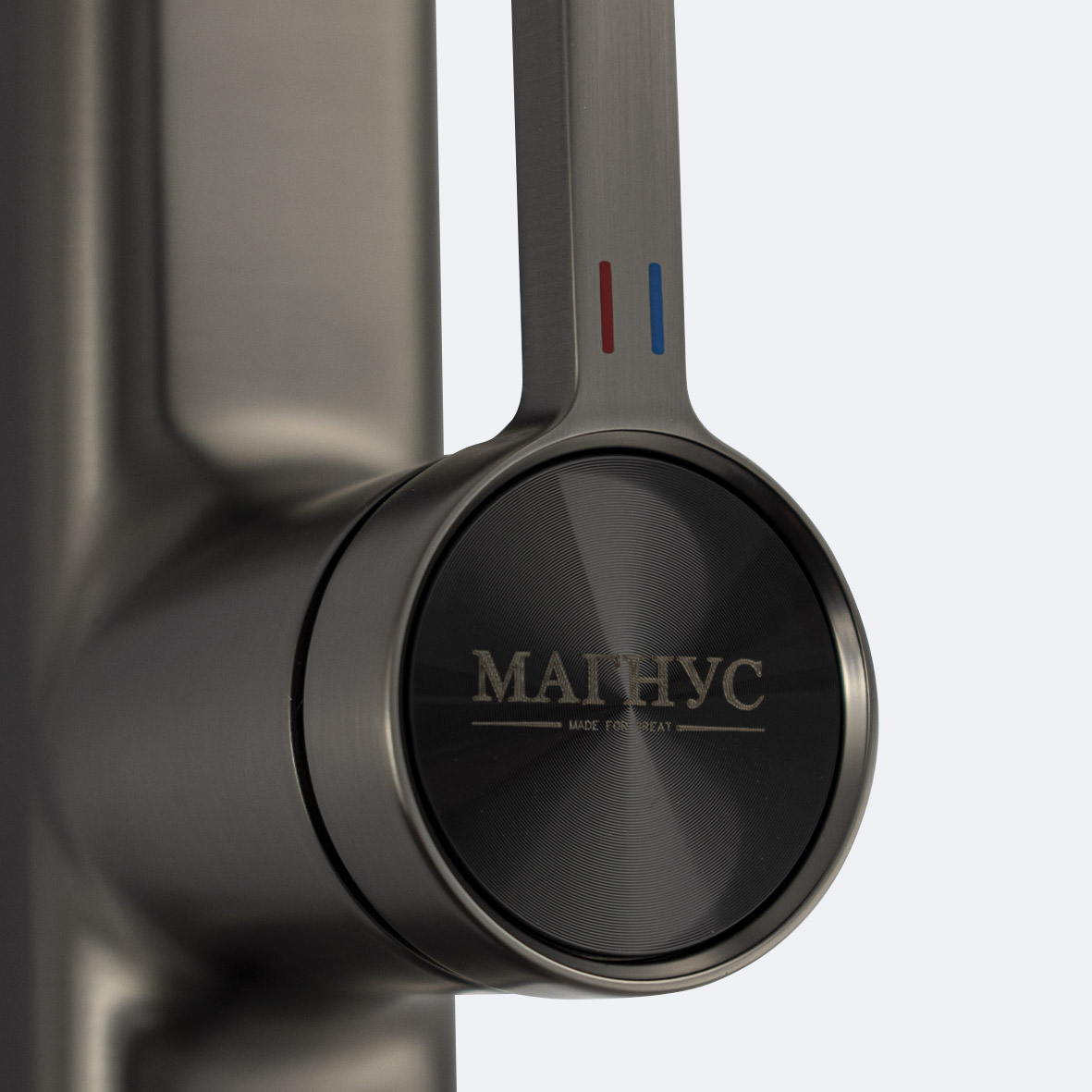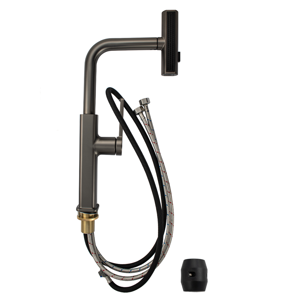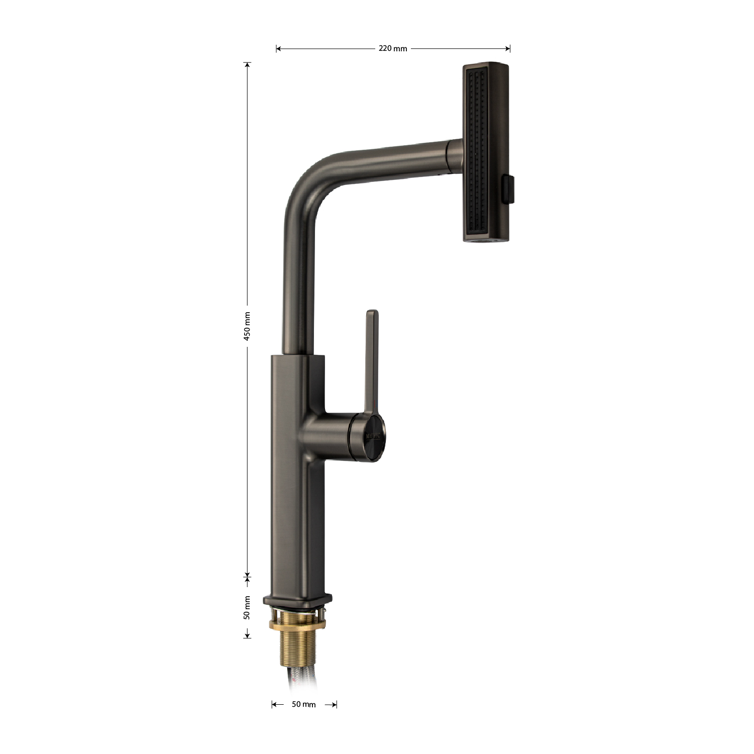 Смеситель для кухонной мойки и раковин, вытяжной излив - лейка с переключением режимов подачи воды, литой корпус под цвет графита, из латуни, шаровый. Крепление резьба - гайка, картридж d = 35 мм, ручка литая. Аэратор для экономии воды. Такая модель может использоваться на домашней кухне, на даче, в медицинских учреждениях и общественных местах. Габаритные размеры: высота 450 мм, длина 220 мм, посадочное седло 50*50 мм, длина резьбы 50 мм. Вес - 2,7 кг, объём - 0,0176 м3. В комплекте паспорт, корпус с изливом, подводка 1/2, крепеж, набор прокладок. Габаритные размеры коробки: длина 690 мм, высота 90 мм, ширина 260 мм.