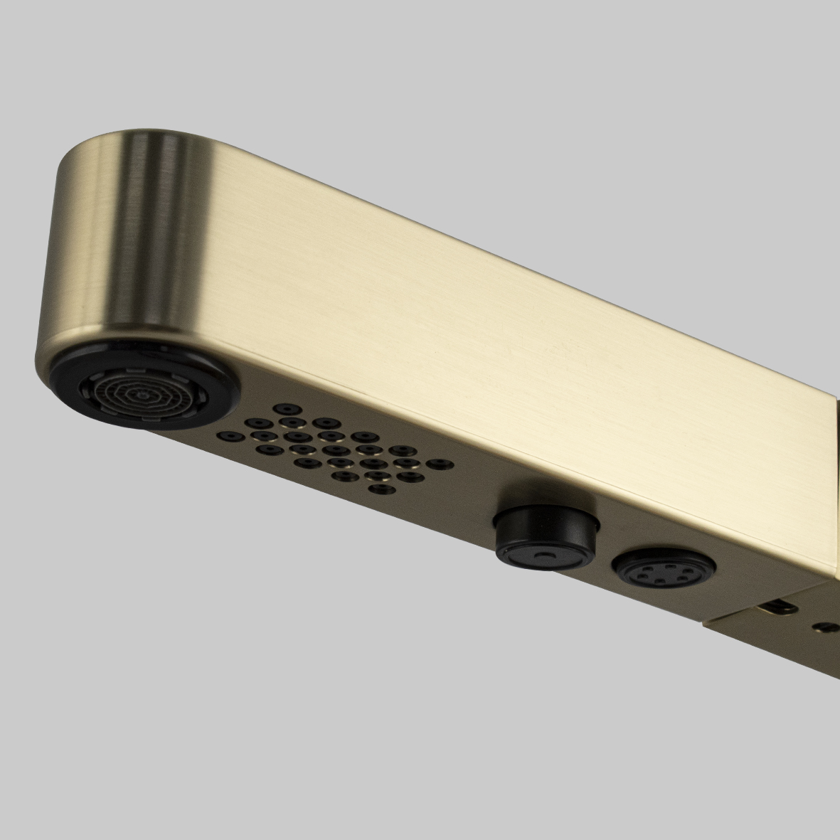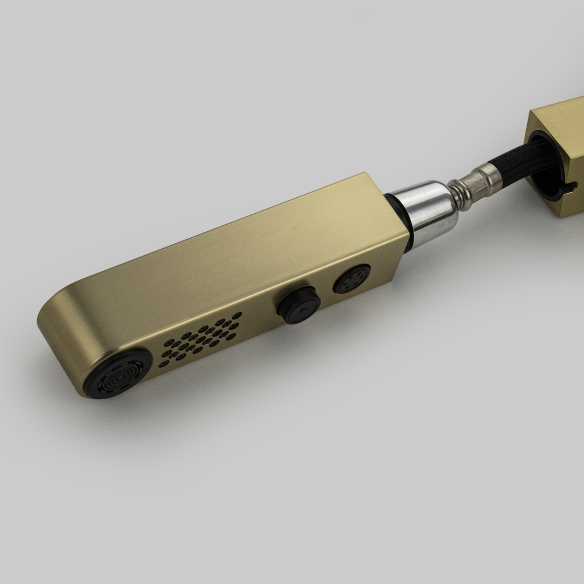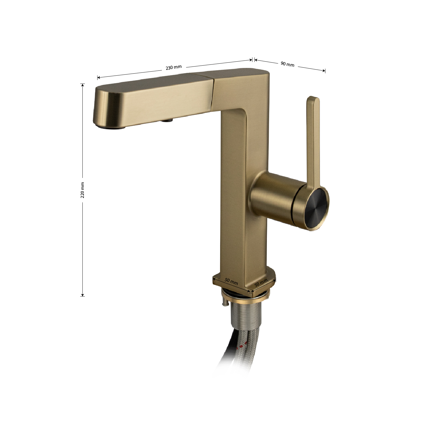 Смеситель для кухонной мойки и раковин, вытяжной излив - лейка с переключением режимов подачи воды, литой корпус под цвет матового золота, из латуни, шаровый. Крепление резьба - гайка, картридж d = 35 мм, ручка литая. Аэратор для экономии воды. Такая модель может использоваться на домашней кухне, на даче, в медицинских учреждениях и общественных местах. Габаритные размеры: высота 220 мм, длина 230 мм, посадочное седло 50*50 мм. Вес - 2,45 кг, объём - 0,01633 м3. В комплекте паспорт, корпус с изливом, подводка 1/2, крепеж, набор прокладок.
