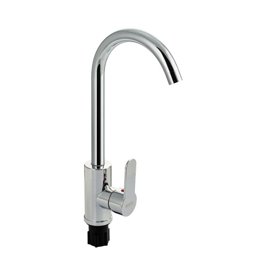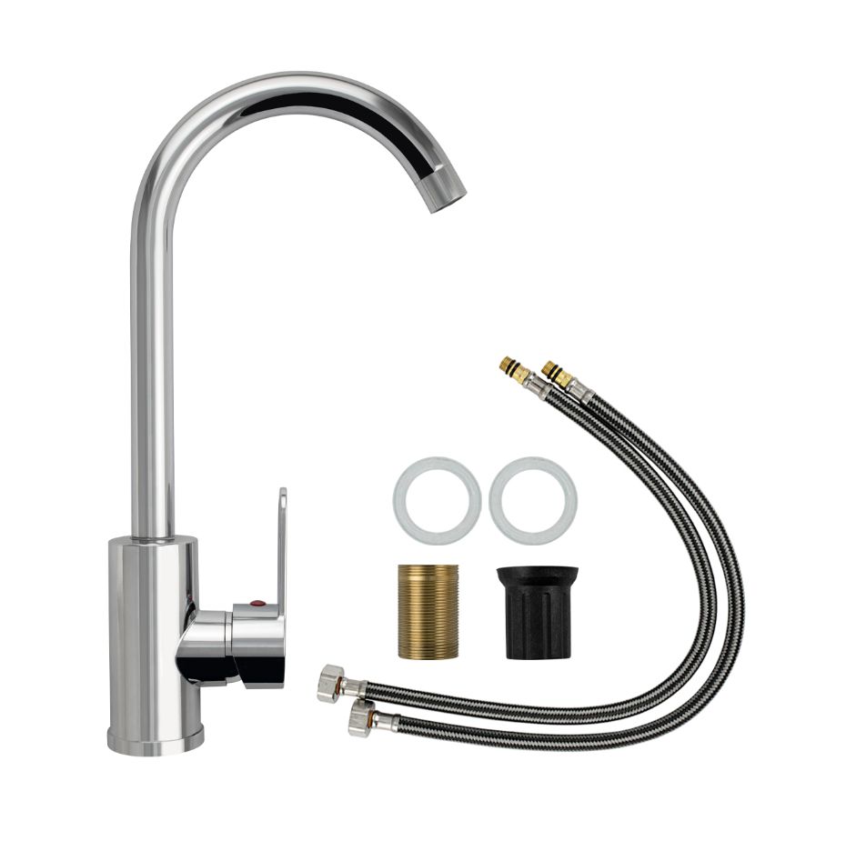 Смеситель для кухонной мойки и раковин, из высокопрочного пластика АБС, с алюминиевым основанием, ХРОМИРОВАННЫЙ, боковой, с высоким С-образным изливом, шаровый. Крепление резьба - гайка, картридж d = мм, литая ручка. Хромированный аэратор для экономии воды. Габаритные размеры: высота 370 мм, длина 200 мм, диаметр посадочного седла 50 мм, длина резьбы 50 мм, длина подводки 500 мм. Вес - 0.90 кг, объём - 0,00516 м3. В комплекте паспорт, корпус с изливом, пластиковая подводка с латунными штуцерами 1/2, крепеж, набор прокладок.