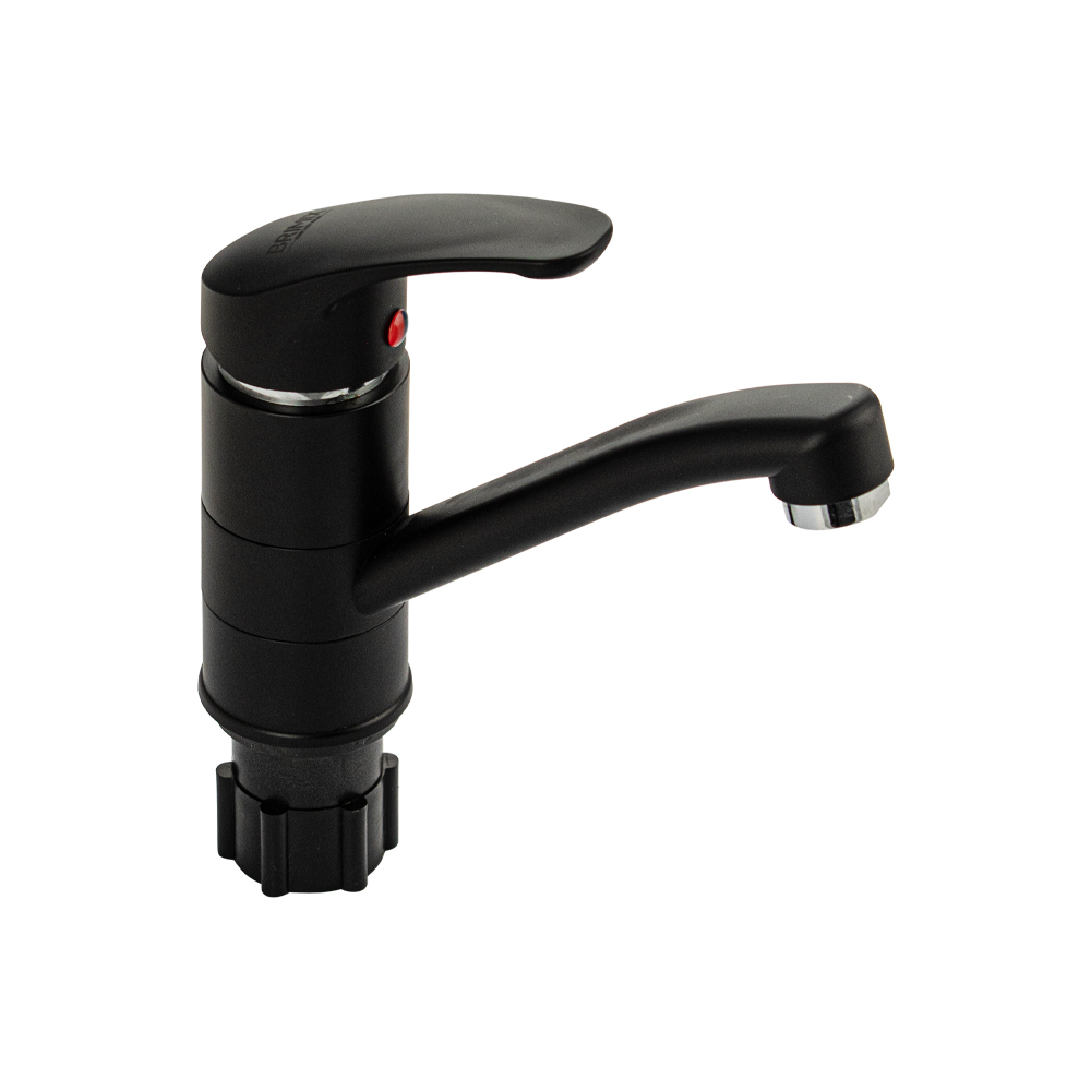 Смеситель для раковины, кухонной мойки, из высокопрочного пластика АБС, черный с коротким изливом 15 см, литой корпус, литая ручка, шаровый. Крепление резьба - гайка, картридж d = 40 мм. хромированный, аэратор для экономии воды. Габаритные размеры: высота 140 мм, длина 170 мм, диаметр посадочного седла 50 мм, длина резьбы 45 мм, длина подводки 450 мм. Вес - 0,57 кг, объём - 0,00183 м3. В комплекте паспорт, корпус, пластиковая подводка с латунными штуцерами 1/2, крепеж, набор прокладок.