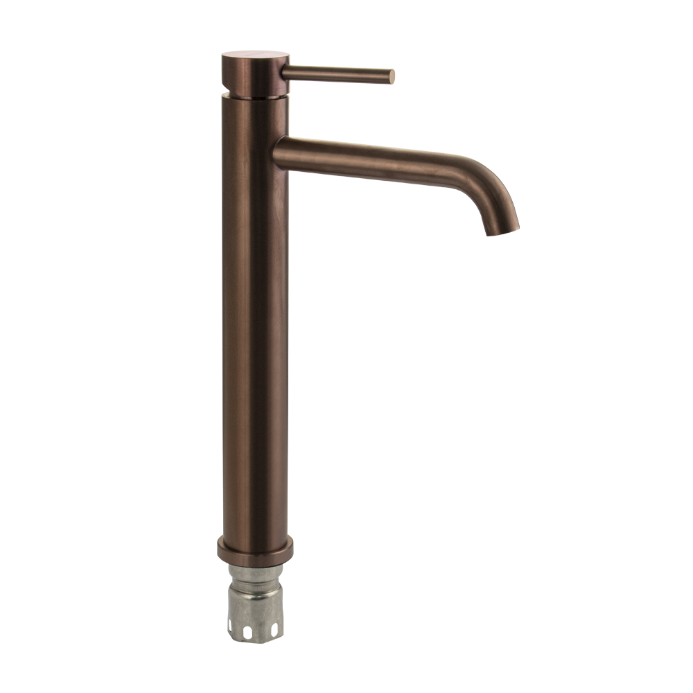Смеситель для раковины, цвет под медь, высокий литой корпус, из нержавеющей стали марки 304, с изогнутым изливом, ручка шток, шаровый. Крепление резьба - гайка, картридж d = 35 мм. Аэратор для экономии воды. Такая модель может использоваться на домашней кухне, на даче, в медицинских учреждениях и общественных местах. Габаритные размеры: высота 350 мм, длина 210 мм, длина излива 170 мм, диаметр посадочного седла 50 мм, длина резьбы 60 мм, длина подводки 450 мм. Вес - 1,400 кг, объём - 0,00445 м3. В комплекте паспорт, корпус, подводка 1/2, крепеж, набор прокладок.