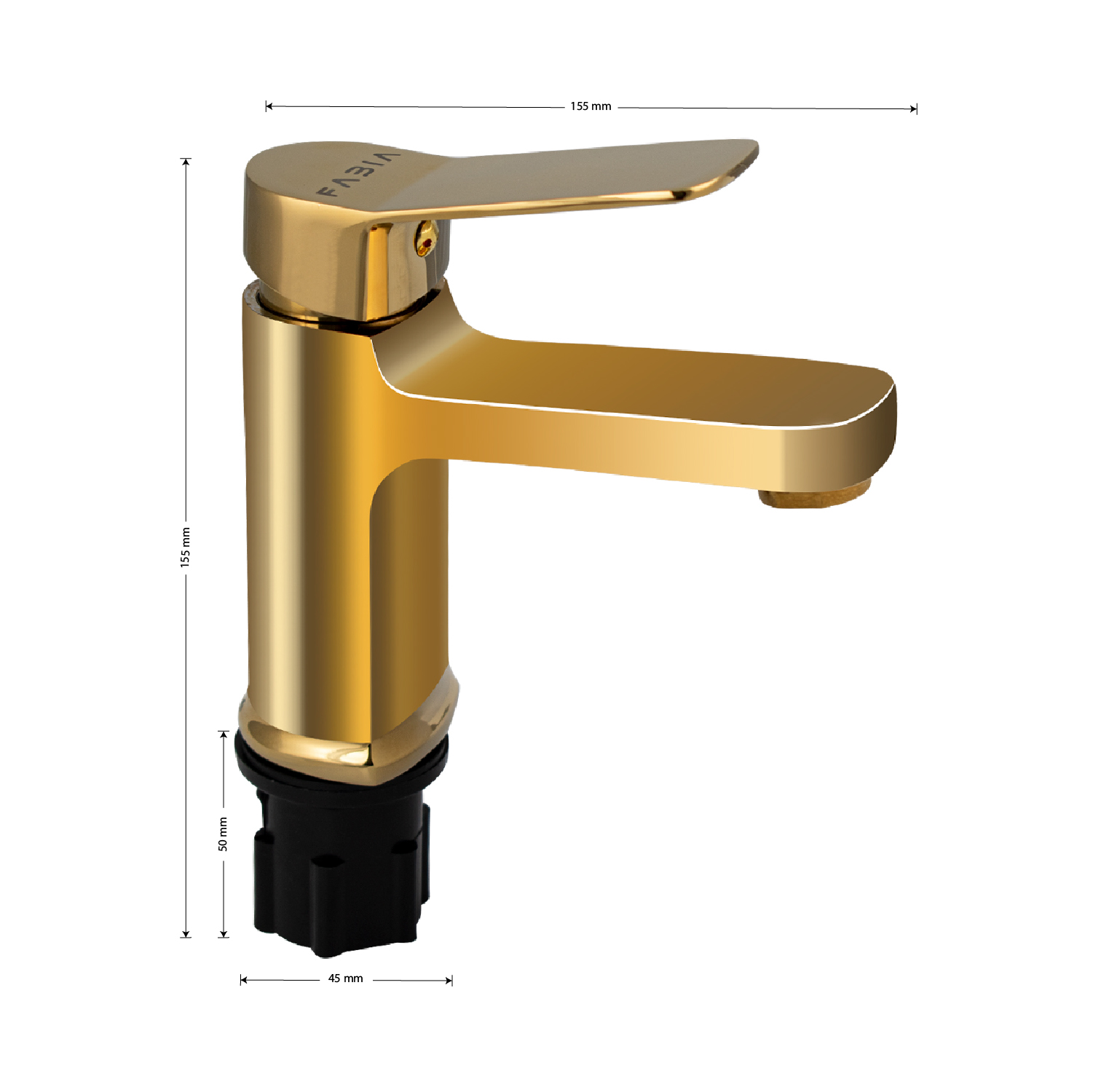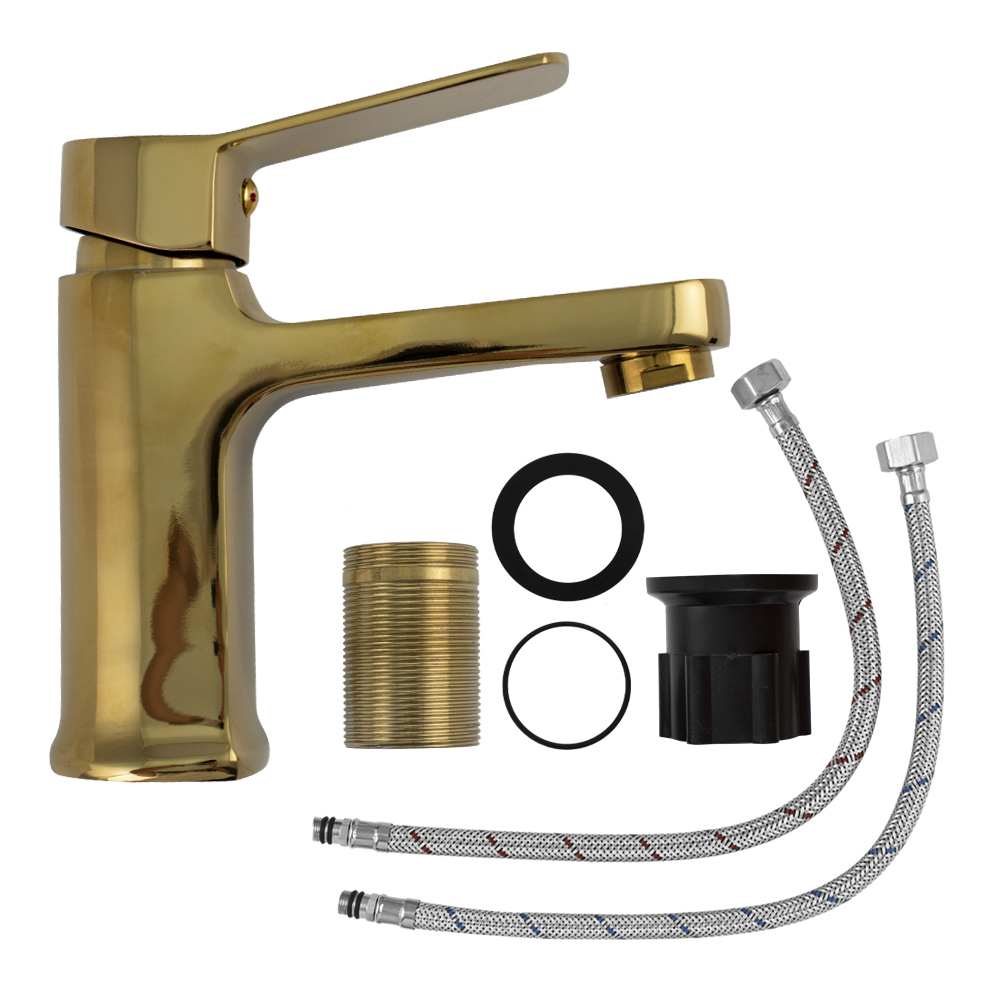 Смеситель для раковины, под золото, с коротким изливом, литой корпус, плоская ручка, шаровый. Материал изготовления - латунь. Крепление резьба - гайка, картридж d = 40 мм. Аэратор для экономии воды. Габаритные размеры: высота 155 мм, длина 155 мм, диаметр посадочного седла 45 мм, длина подводки 500 мм. Вес - 1.0 кг, объём - 0.00239 м3. В комплекте паспорт, корпус, подводка 1/2, крепеж, набор прокладок.