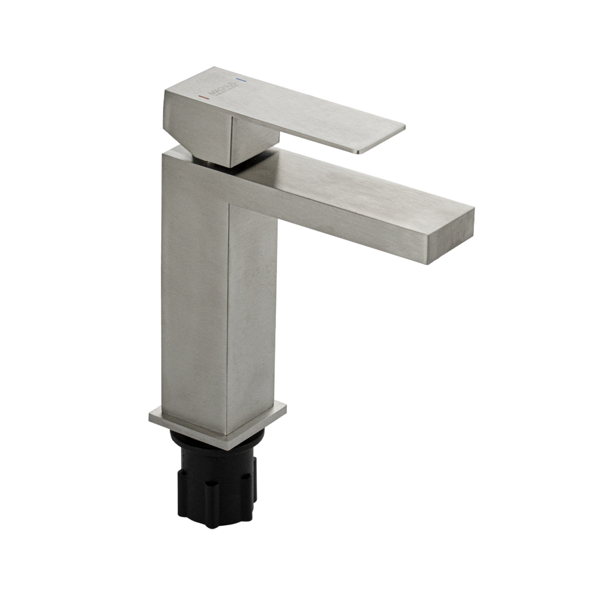 Смеситель для раковины, матовый квадратный корпус, из нержавеющей стали марки 304, с длинным изливом, литая ручка, шаровый. Крепление резьба - гайка, картридж d = 35 мм. Аэратор для экономии воды. Такая модель может использоваться на домашней кухне, на даче, в медицинских учреждениях и общественных местах. Габаритные размеры: высота 175 мм, длина 150 мм, посадочное седло 50*50 мм, длина резьбы 45 мм, длина подводки 450 мм. Вес - 1.05 кг, объём - 0.00247 м3. В комплекте паспорт, корпус, подводка 1/2, крепеж, набор прокладок.