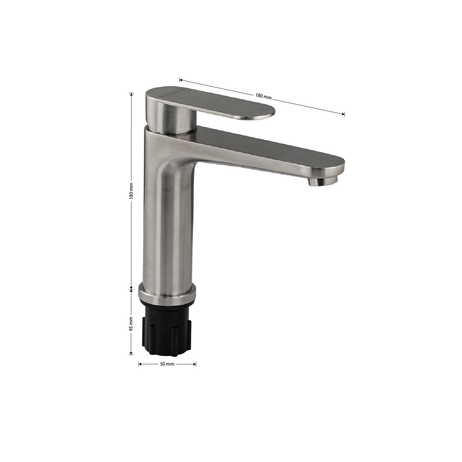 Смеситель для раковины, матовый литой корпус, из нержавеющей стали марки SUS 304, с коротким литым изливом, литая ручка, шаровый. Крепление резьба - гайка, картридж d =  мм. Аэратор для экономии воды. Такая модель может использоваться на домашней кухне, на даче, в медицинских учреждениях и общественных местах. Габаритные размеры: высота 190 мм, длина 180 мм, диаметр посадочного седла 50 мм, длина резьбы 50 мм, длина подводки 500 мм. Вес - 1,1 кг, объём - 0,00319 м3. В комплекте паспорт, корпус, подводка 1/2, крепеж, набор прокладок.