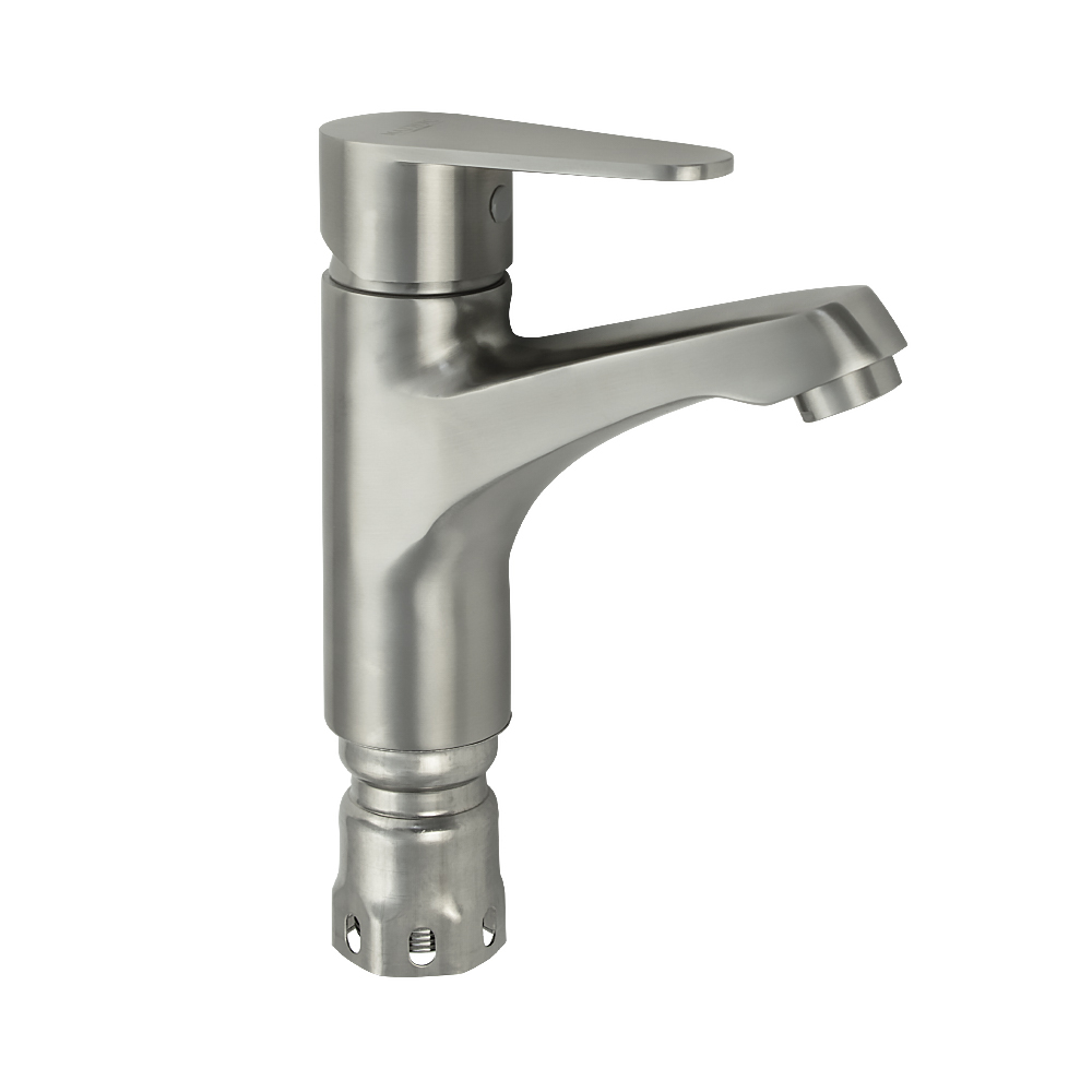 Смеситель для раковины, матовый литой корпус, из нержавеющей стали марки 304, с коротким литым изливом, литая ручка, шаровый. Крепление резьба - гайка, картридж d = 35 мм. Аэратор для экономии воды. Такая модель может использоваться на домашней кухне, на даче, в медицинских учреждениях и общественных местах. Габаритные размеры: высота 145 мм, длина 150 мм, длина излива 105 мм, диаметр посадочного седла 45 мм, длина резьбы 60 мм, длина подводки 450 мм. Вес - 1,750 кг, объём - 0,00237 м3. В комплекте паспорт, корпус, подводка 1/2, крепеж, набор прокладок.