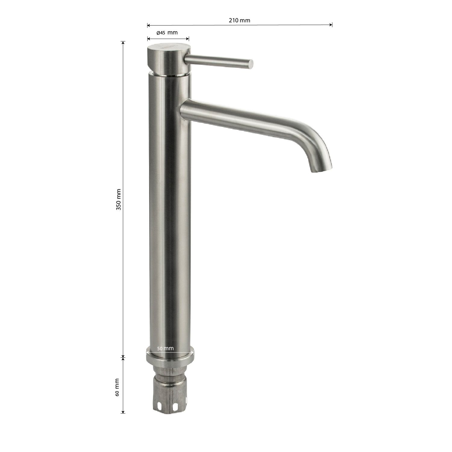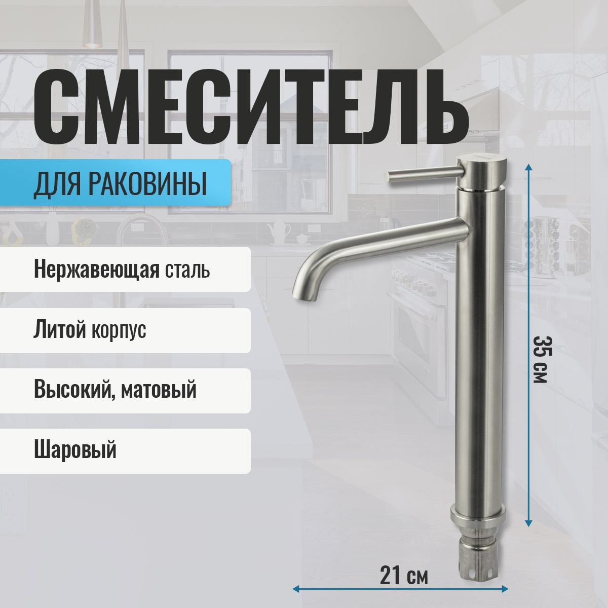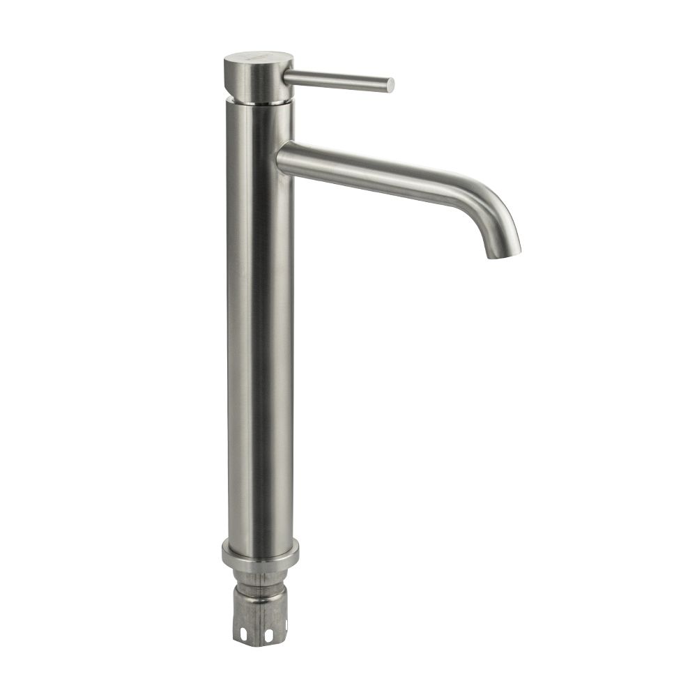 Смеситель для раковины, высокий матовый литой корпус, из нержавеющей стали марки 304, с изогнутым изливом, ручка шток, шаровый. Крепление резьба - гайка, картридж d = 35 мм. Аэратор для экономии воды. Такая модель может использоваться на домашней кухне, на даче, в медицинских учреждениях и общественных местах. Габаритные размеры: высота 350 мм, длина 210 мм, длина излива 170 мм, диаметр посадочного седла 50 мм, длина резьбы 60 мм, длина подводки 450 мм. Вес - 1,400 кг, объём - 0,00445 м3. В комплекте паспорт, корпус, подводка 1/2, крепеж, набор прокладок.