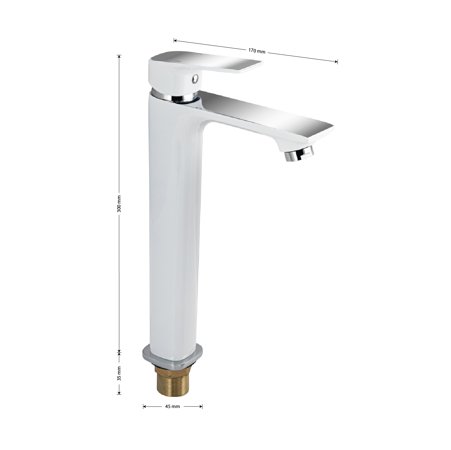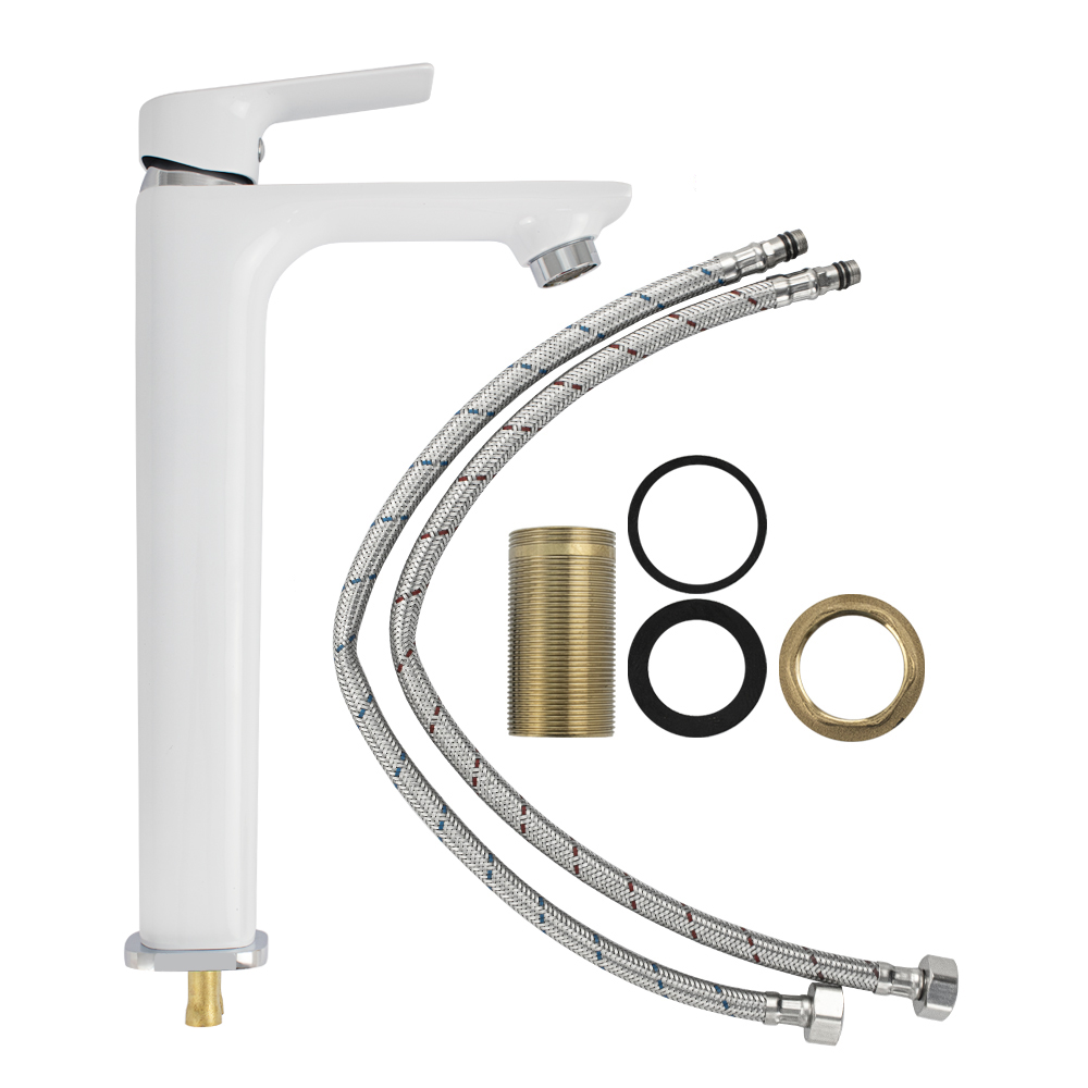 Смеситель для раковины, литой корпус, цвет белый с хромированной вставкой, с прямым плоским изливом, ручка литая, шаровый. Крепление резьба - гайка, картридж d = 35 мм. Аэратор для экономии воды. Такая модель может использоваться на домашней кухне, на даче, в медицинских учреждениях и общественных местах. Габаритные размеры: высота 300 мм, длина 170 мм, посадочное седло 45 мм, длина резьбы 35 мм, длина подводки 500 мм. Вес - 1,100 кг, объём - 0,0058 м3. В комплекте паспорт, корпус, подводка 1/2, крепеж, набор прокладок.