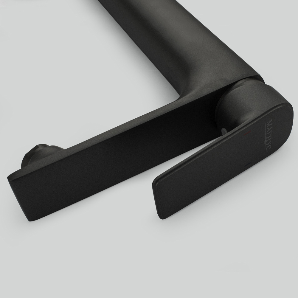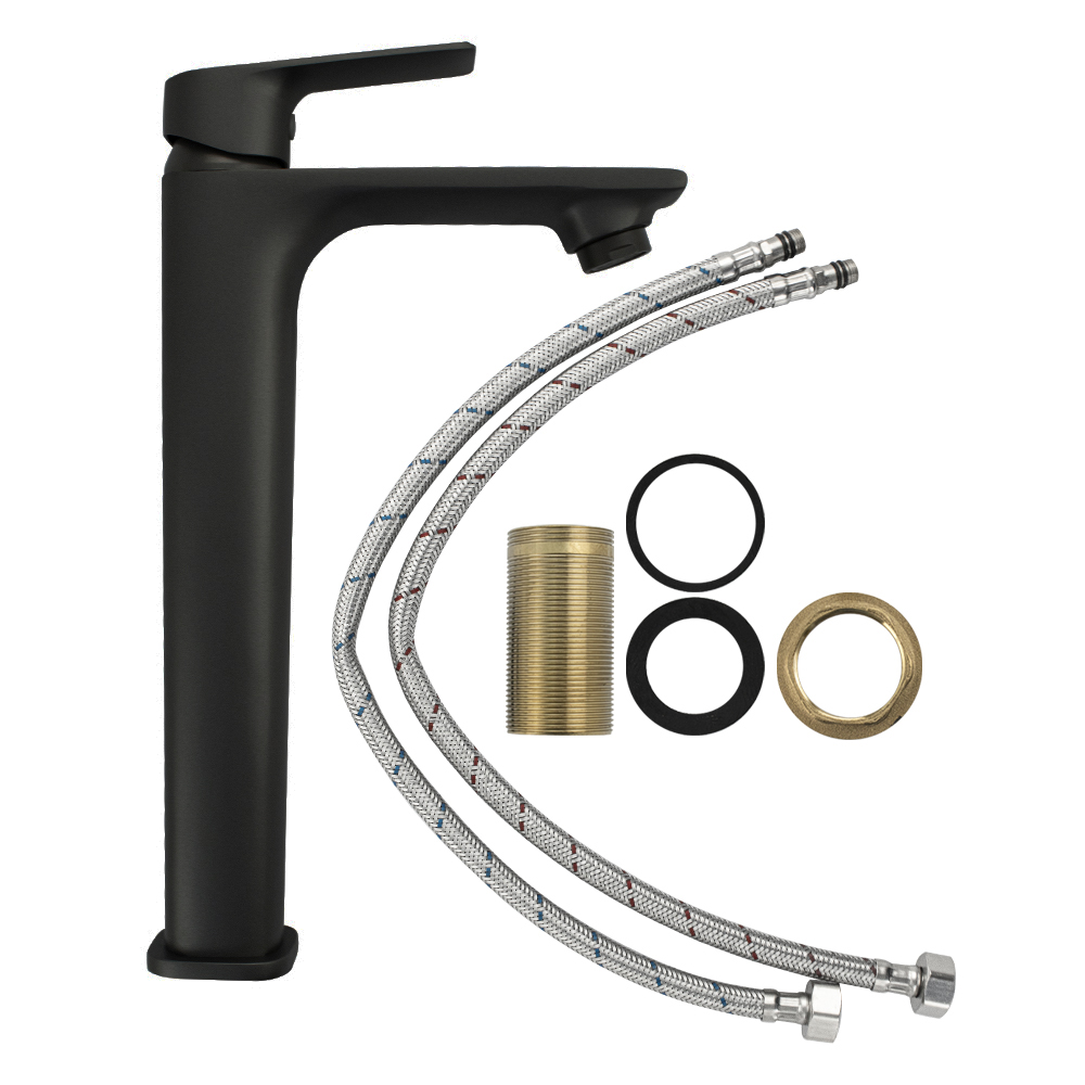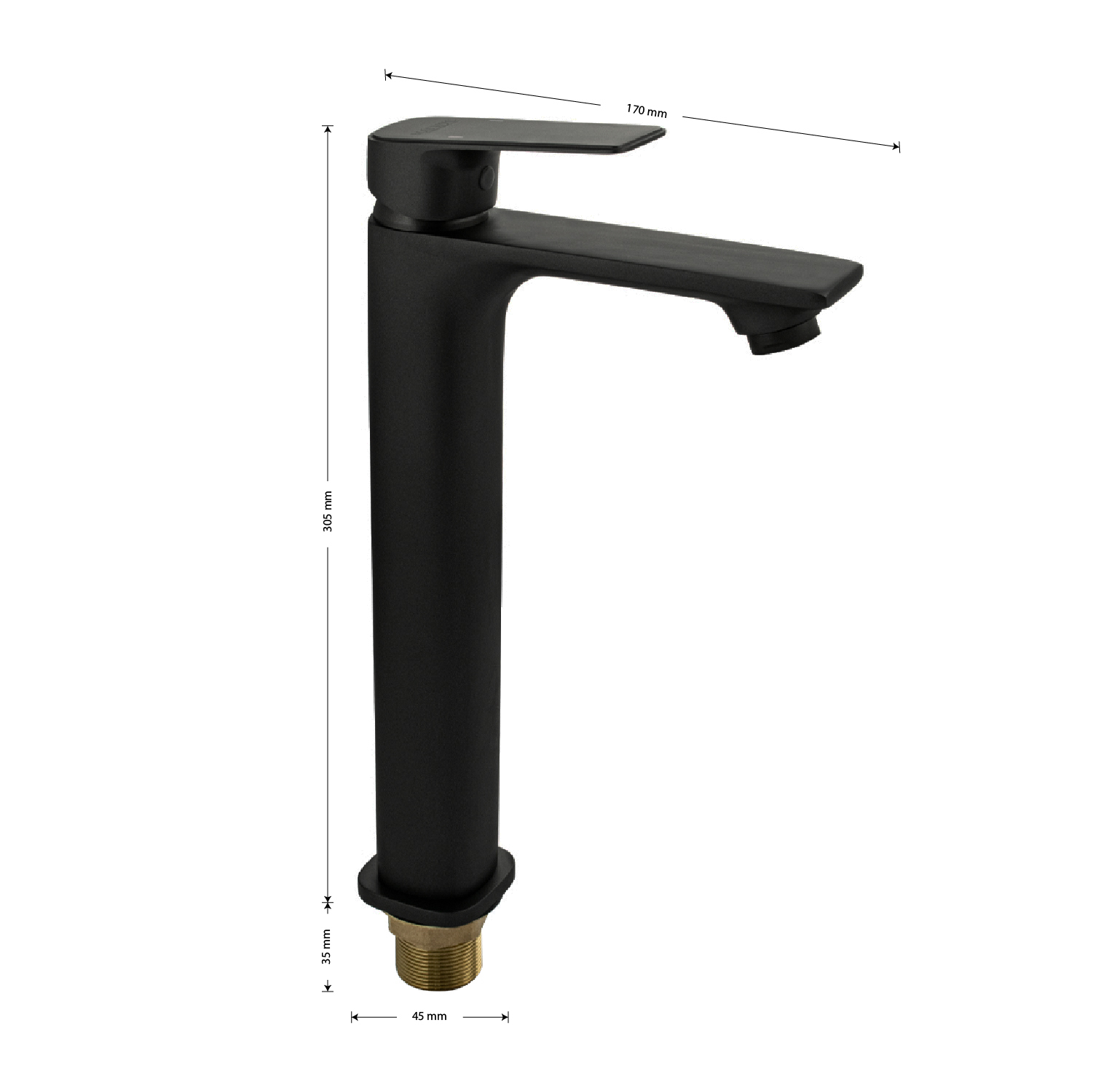 Смеситель для раковины, высокий литой корпус, цвет чёрный, с прямым плоским изливом, ручка литая, шаровый. Крепление резьба - гайка, картридж d = 35 мм. Аэратор для экономии воды. Такая модель может использоваться на домашней кухне, на даче, в медицинских учреждениях и общественных местах. Габаритные размеры: высота 305 мм, длина 170 мм, посадочное седло 45*45 мм, длина резьбы 35 мм, длина подводки 500 мм. Вес - 1,500 кг, объём - 0,00532 м3. В комплекте паспорт, корпус, подводка 1/2, крепеж, набор прокладок.