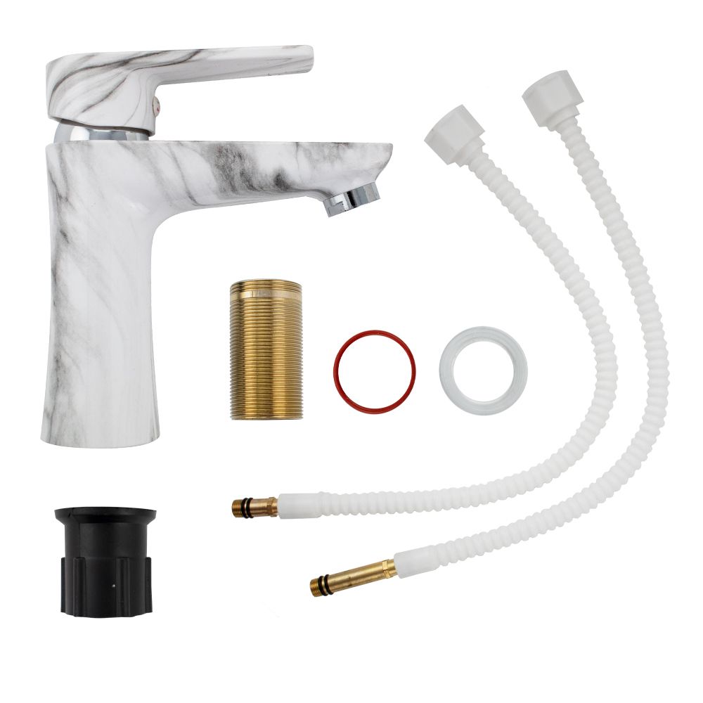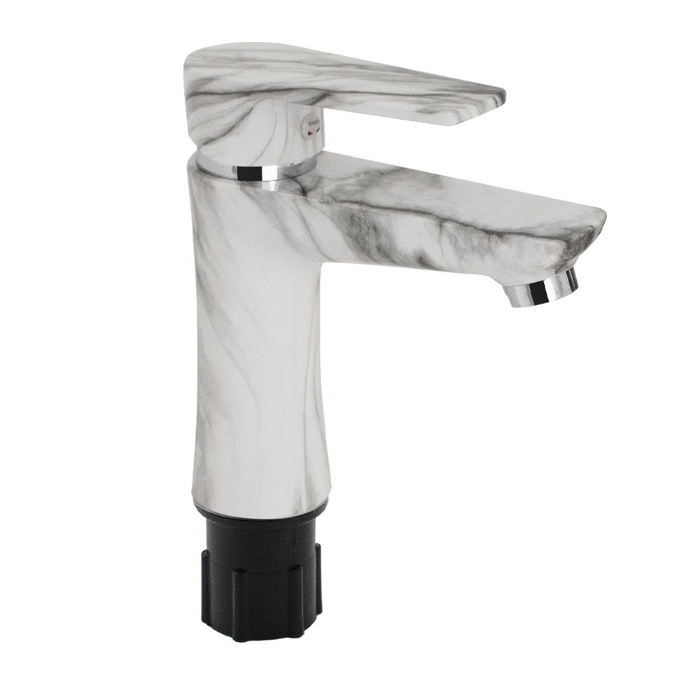 Смеситель для раковины, из высокопрочного пластика АБС, БЕЛЫЙ МРАМОР, с коротким изливом, литой корпус, литая ручка, шаровый. Крепление резьба - гайка, картридж d = 40 мм, хромированный, аэратор для экономии воды. Габаритные размеры: высота 160 мм, длина 145 мм, длина излива 105 мм, диаметр посадочного седла 50 мм, длина резьбы 50 мм, длина подводки 400 мм. Вес - 0,650 кг, объём - 0,00417 м3. В комплекте паспорт, корпус, пластиковая подводка с латунными штуцерами 1/2, крепеж, набор прокладок.