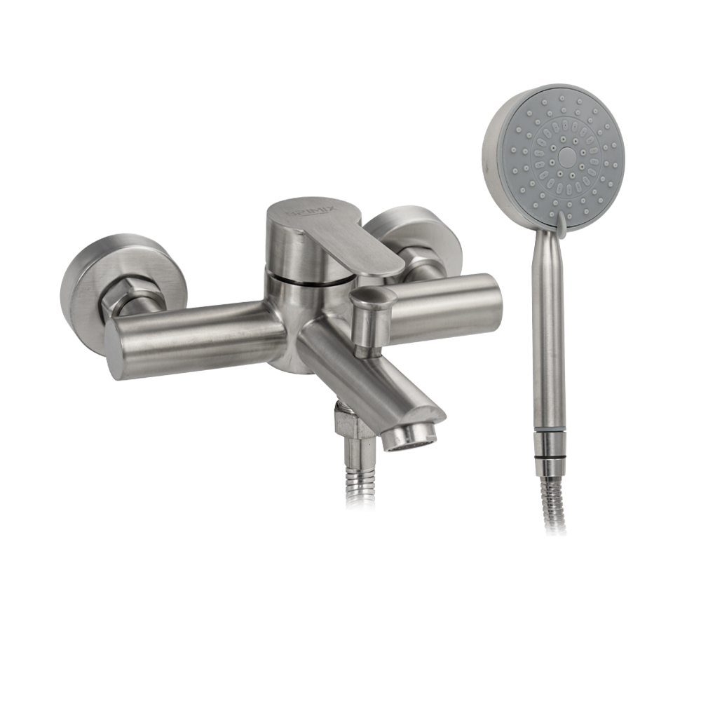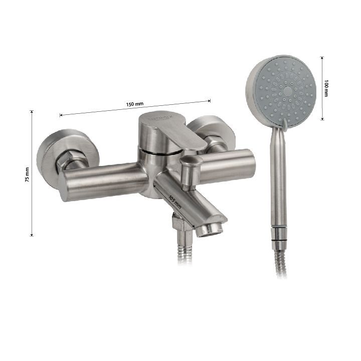 Смеситель матовый из нержавеющей стали марки 304 в ванную / душевую комнату, с коротким литым изливом. Картридж d = 35 мм, ручка литая. Дутый, большой корпус с дивертором м/к на корпусе, аэратор для экономии воды, чашки нержавеющая сталь, гайки и эксцентрики из нержавеющей стали. Габаритные размеры: ширина 150 мм, высота 75 мм, длина излива 105 мм, диаметр чашки 60 мм, длина шланга 150 см, лейка d = 100 мм. Вес - 1,81 кг, объём - 0,00600 м3. В комплекте корпус с изливом, дивертор, кронштейн, паспорт, крепёж, прокладки, лейка, шланг.
