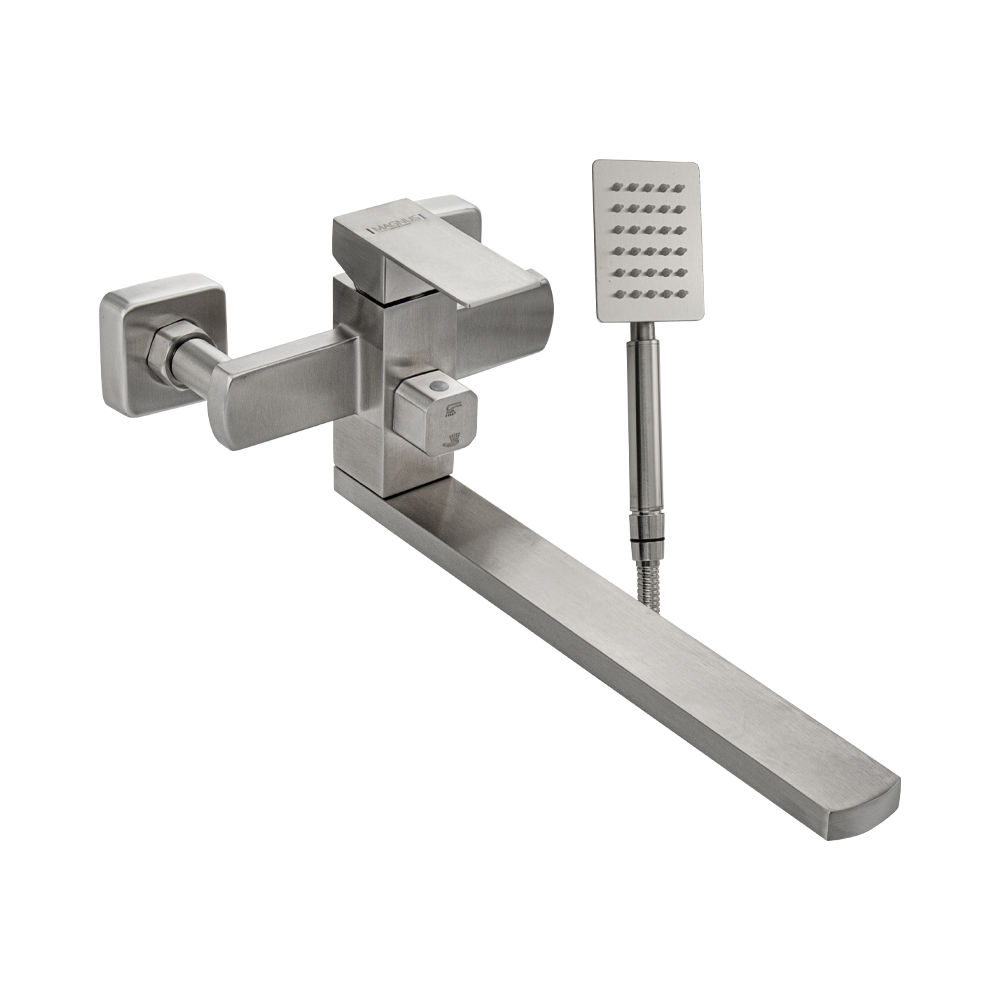 Смеситель матовый, из нержавеющей стали марки 304 в ванную / душевую комнату, с поворотным длинным плоским изливом. Картридж d = 35 мм, ручка литая. Квадратный, большой корпус с дивертором м/к на корпусе, аэратор для экономии воды, чашки, гайки и эксцентрики из нержавеющей стали. Габаритные размеры: ширина 150 мм, высота 145 мм, длина 190 мм, длина шланга 150 см, лейка d = мм. Вес - 2,98 кг, объём - 0,01204 м3. В комплекте корпус с изливом, дивертор, кронштейн, паспорт, крепёж, прокладки, лейка, шланг.