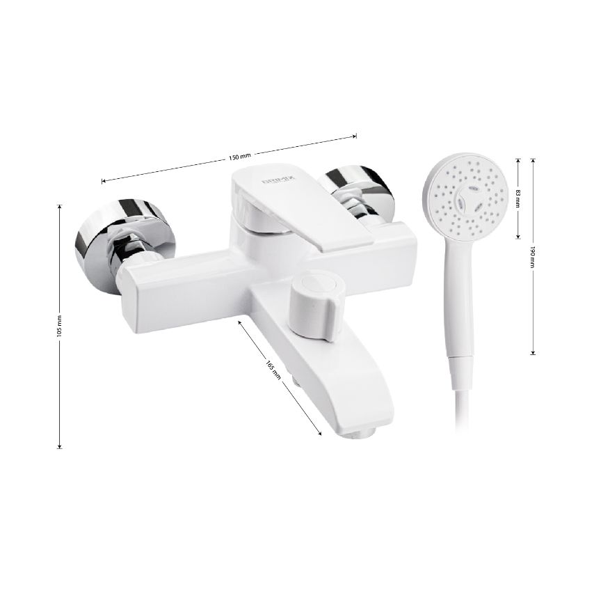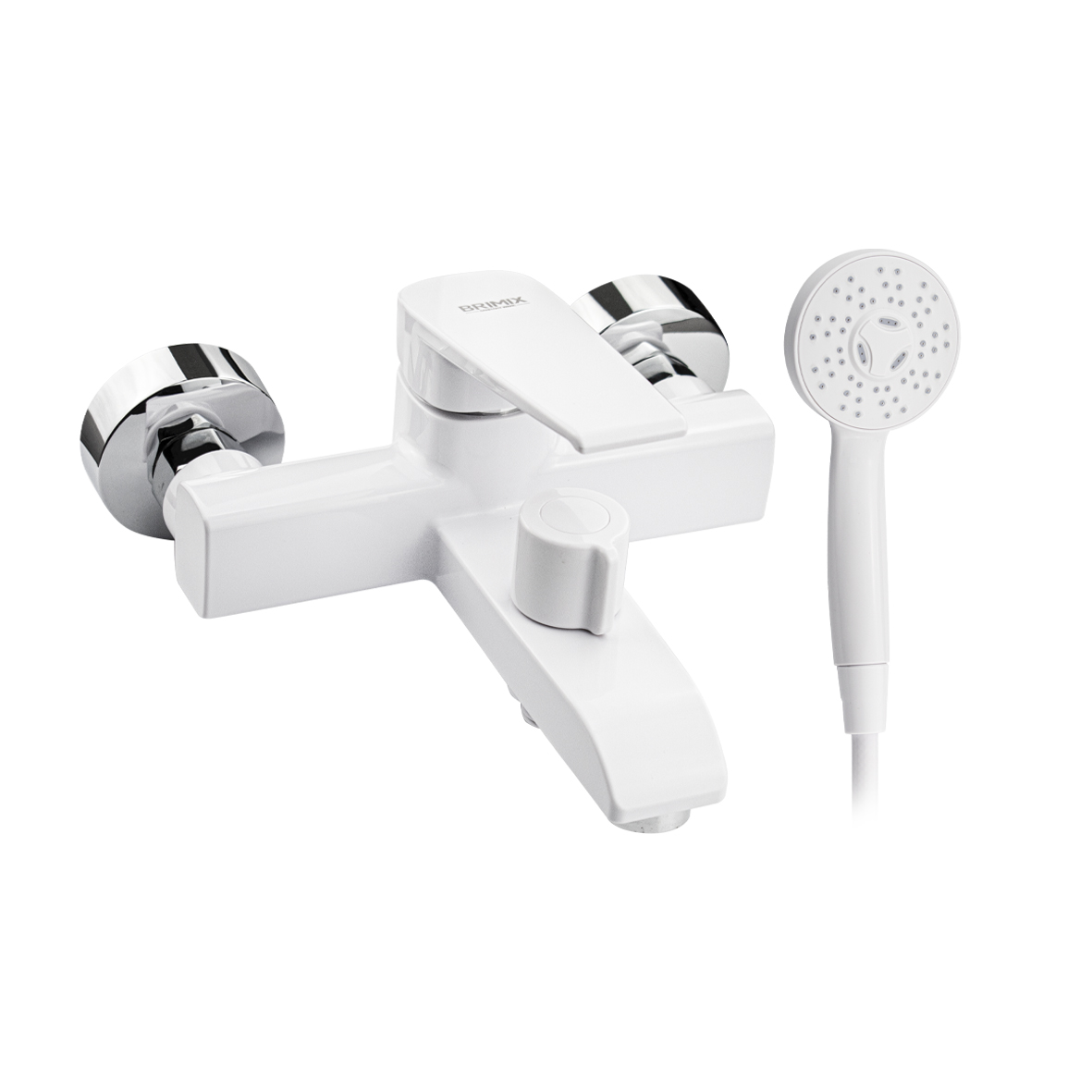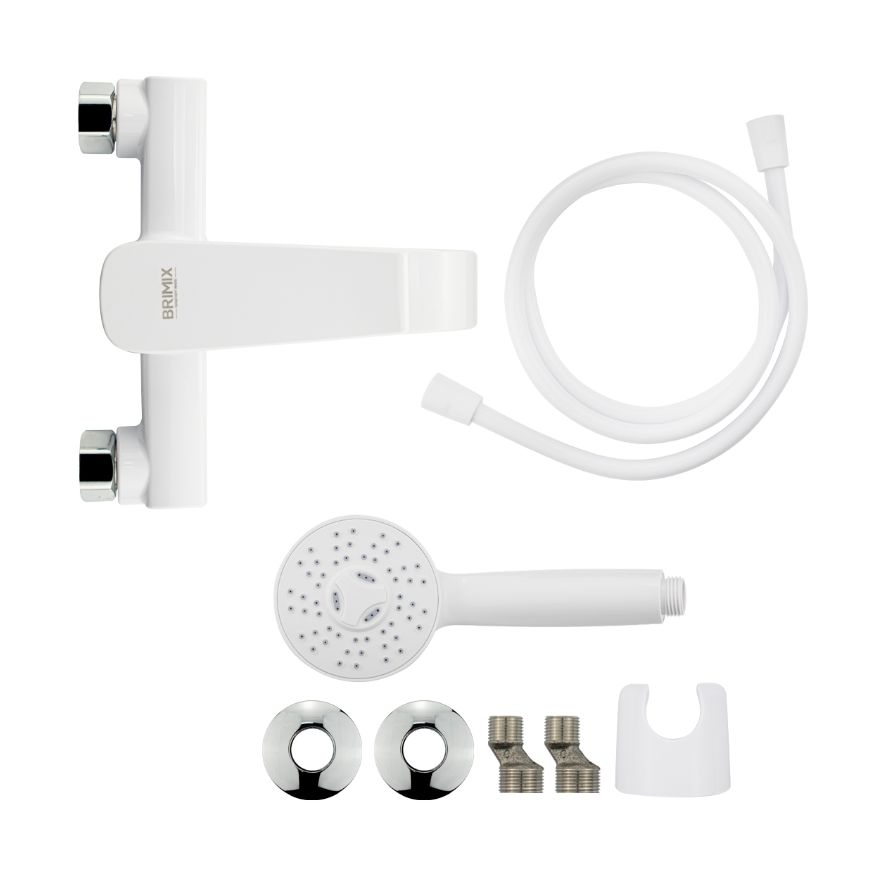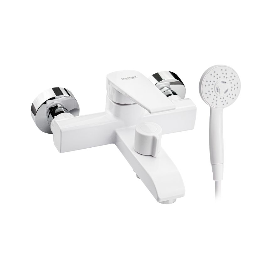 Смеситель из высокопрочного пластика АБС, БЕЛЫЙ в ванную / душевую комнату с коротким изливом, литой квадратный корпус, шаровый, с дивертором м/к на корпусе. Картридж d = 40 мм, литая ручка, хромированный аэратор для экономии воды, хромированные чашки и эксцентрики. Габаритные размеры: ширина 150 мм, высота корпуса 105 мм, длина 165 мм, душевая лейка d = 83 мм, шланг 150 см. Вес - 0,81 кг, объём - 0,00514 м3. В комплекте паспорт, корпус с изливом, дивертор, душевая лейка, шланг, кронштейн, комплект крепежа и прокладок.