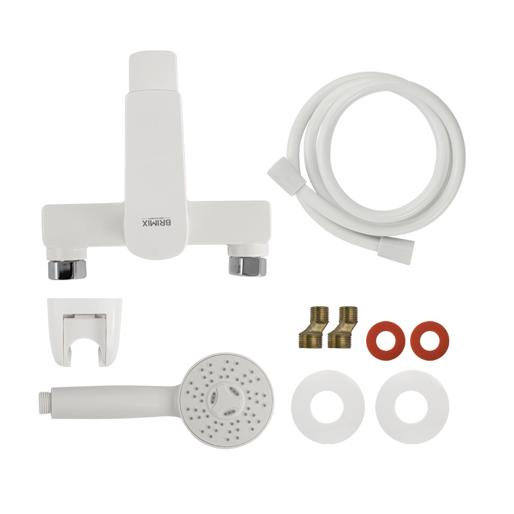 Смеситель из высокопрочного пластика АБС, БЕЛЫЙ в ванную / душевую комнату с коротким изливом, литой корпус, шаровый, с дивертором м/к на корпусе. Картридж d = 40 мм, литая ручка, хромированный аэратор для экономии воды, хромированные чашки и эксцентрики. Габаритные размеры: ширина 150 мм, высота корпуса 120 мм, длина 160 мм, душевая лейка d = 85 мм, шланг 150 см. Вес - 1,062 кг, объём - 0,0045 м3. В комплекте паспорт, корпус с изливом, душевая лейка, шланг, кронштейн, комплект крепежа и прокладок.