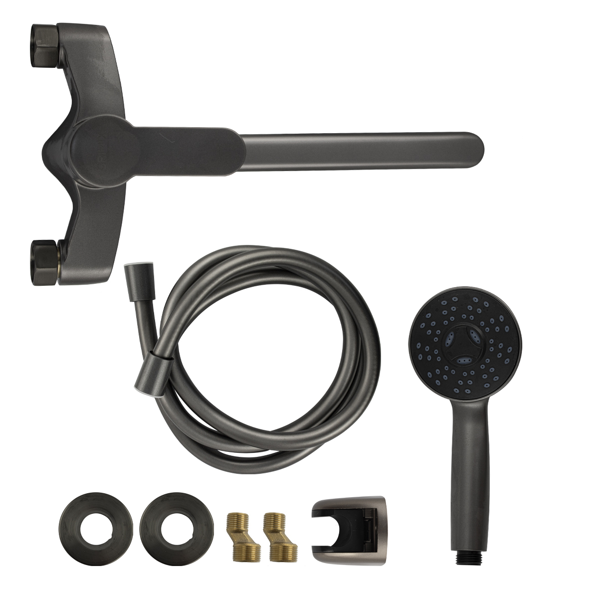 Смеситель из высокопрочного АБС пластика, цвета графит, в ванную / душевую комнату с длинным, плоским изливом, литой корпус, шаровый с дивертором м/к на корпусе. Картридж d = мм, литая ручка, хромированный, аэратор для экономии воды, хромированные чашки и эксцентрики. Габаритные размеры: ширина 150 мм, высота корпуса 140 мм, длина излива 300 мм, душевая лейка d = 85 мм, шланг 150 см. Вес - кг, объём - м3. В комплекте паспорт, корпус с изливом, дивертор, душевая лейка, шланг, кронштейн, комплект крепежа и прокладок.