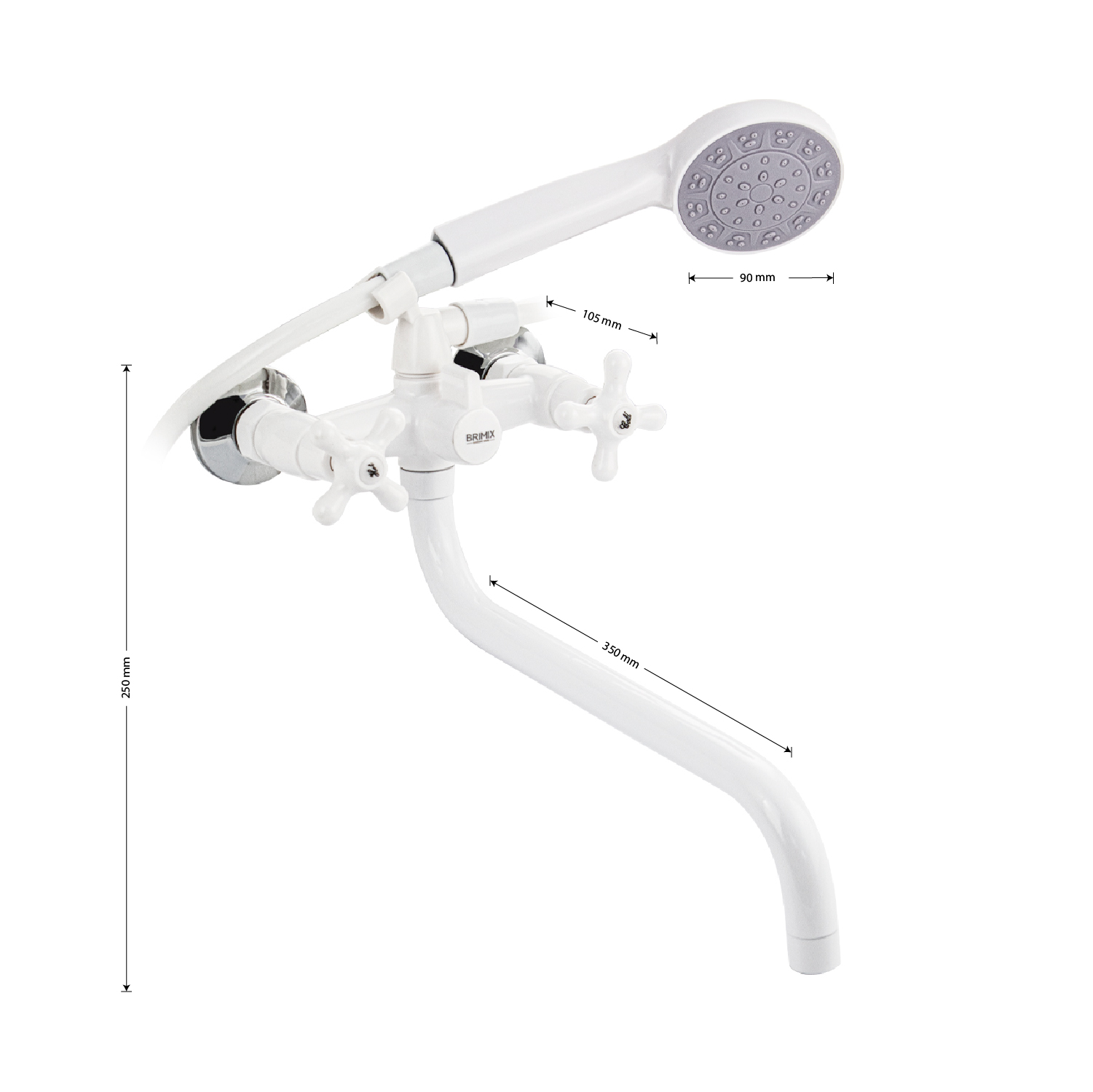 Смеситель из высокопрочного пластика АБС - белый, в ванную/душевую комнату, с длинным, круглым изливом, литой корпус, металлокерамика, с дивертором м/к на корпусе. Материал изготовления — пластик. Кранбуксы металлокерамика 1/2, ручки крест поворот на 90˚, аэратор для экономии воды, чашки и эксцентрики. Габаритные размеры: ширина 150 мм, высота корпуса 250 мм, длина излива 350 мм, душевая лейка d = 90 мм, шланг 150 см, диаметр чашки 65 мм. Вес - 1,12 кг, объём - 0,0045 м3. В комплекте паспорт, корпус с изливом, дивертор, душевая лейка, шланг, кронштейн, комплект крепежа и прокладок.