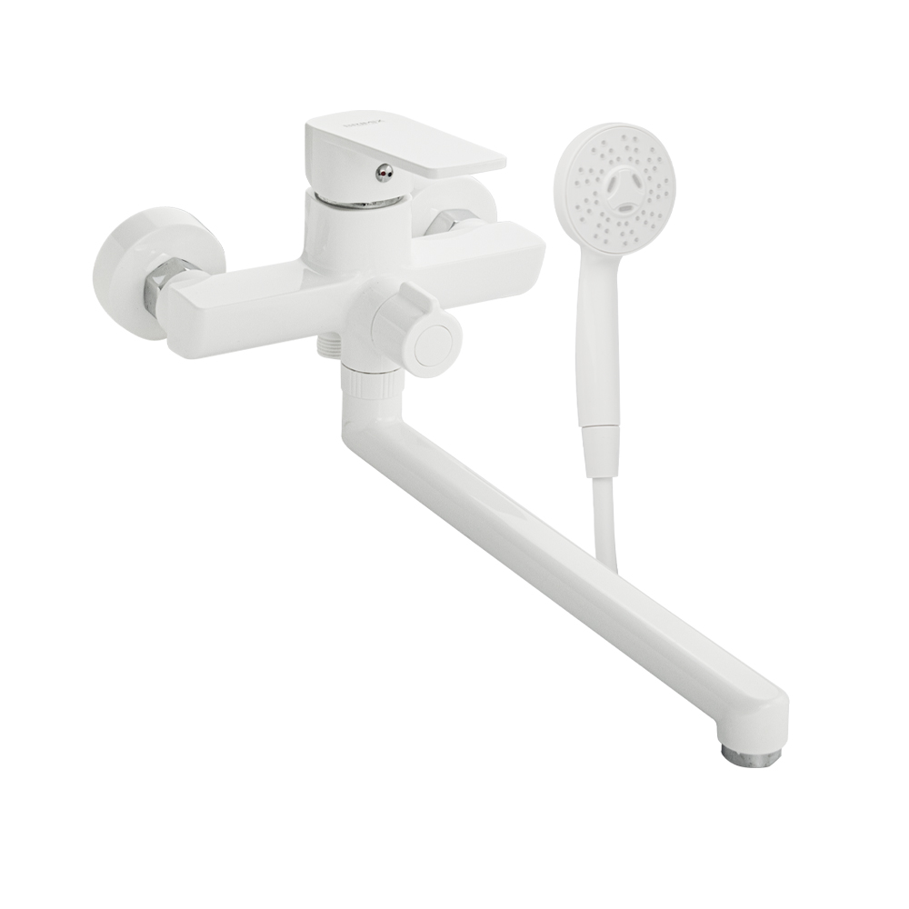 Смеситель из высокопрочного пластика АБС, БЕЛЫЙ в ванную / душевую комнату с длинным, плоским изливом, литой корпус, шаровый с дивертором м/к на корпусе. Картридж d = 40 мм, литая ручка, хромированный, аэратор для экономии воды, хромированные чашки и эксцентрики. Габаритные размеры: ширина 150 мм, высота корпуса 170 мм, длина излива 320 мм, душевая лейка d = 85 мм, шланг 150 см. Вес - 1,118 кг, объём - 0,0061 м3. В комплекте паспорт, корпус с изливом, дивертор, душевая лейка, шланг, кронштейн, комплект крепежа и прокладок.
