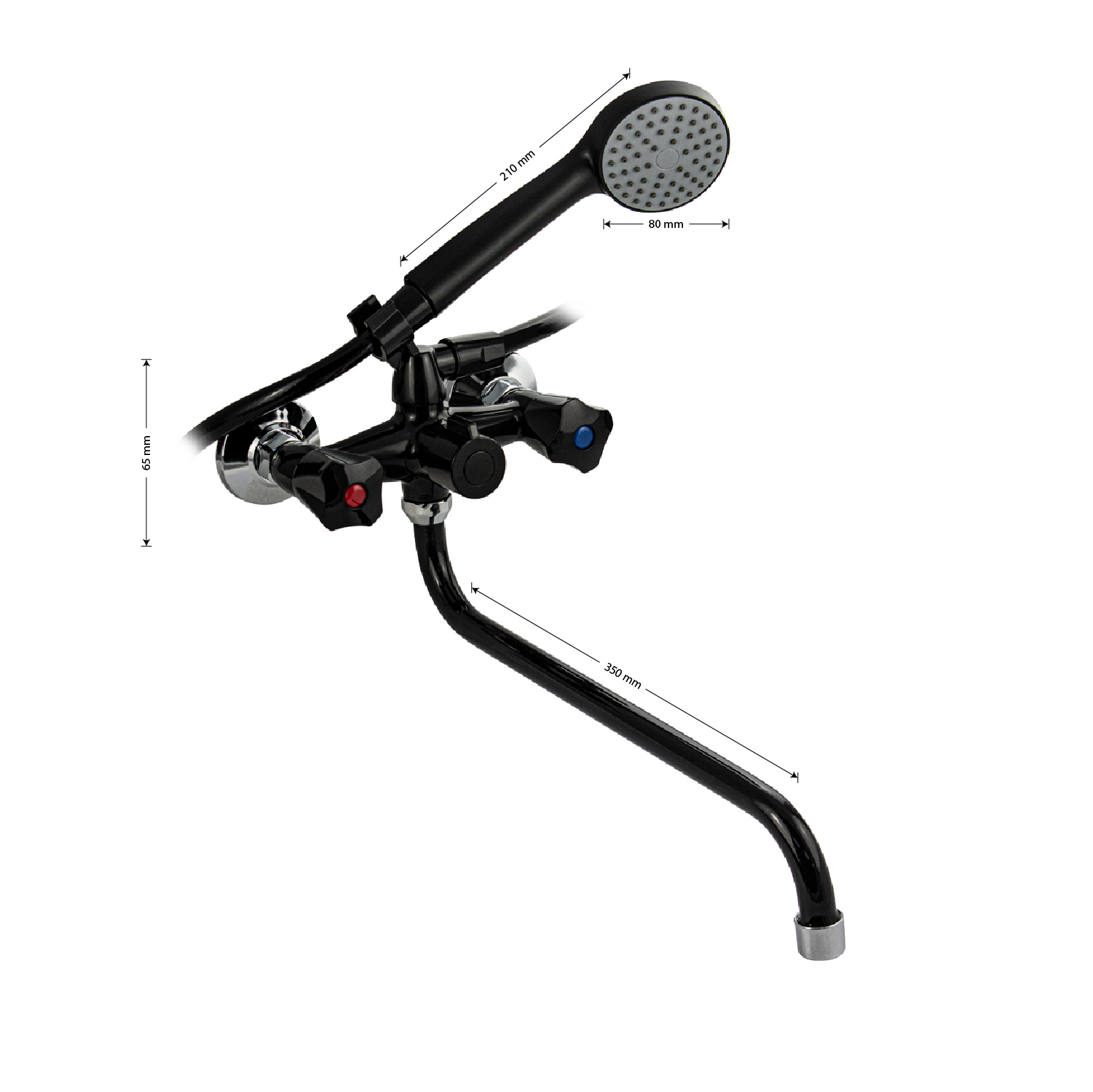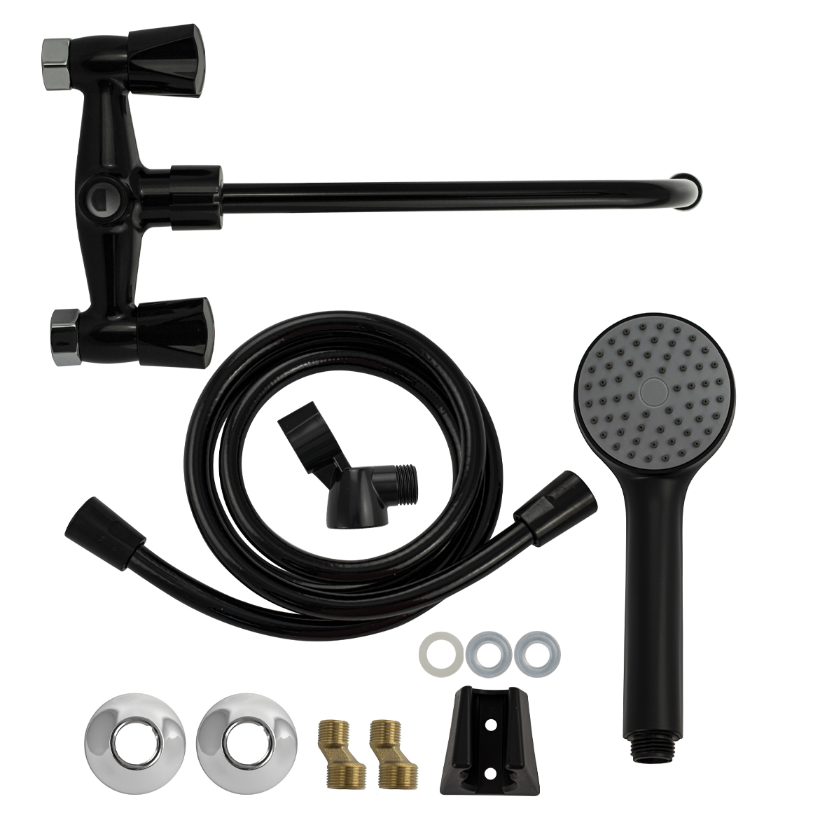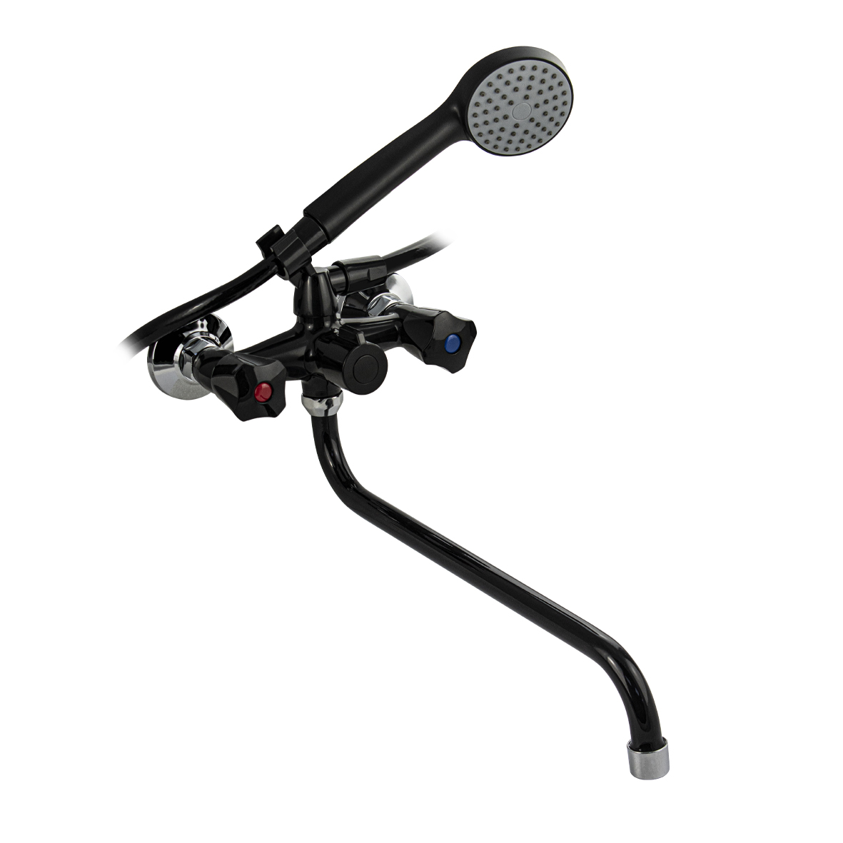 Смеситель из высокопрочного пластика АБС - черный, в ванную/душевую комнату, с длинным, круглым изливом, литой корпус, металлокерамика, с дивертором м/к на корпусе. Материал изготовления — пластик. Кранбуксы металлокерамика 1/2, ручки ромб поворот на 90˚, аэратор для экономии воды, чашки и эксцентрики. Габаритные размеры: ширина 150 мм, высота корпуса 65 мм, длина излива 350 мм, душевая лейка d = 85 мм, шланг 150 см, диаметр чашки 65 мм. Вес - 1,02 кг, объём - 0,00622 м3. В комплекте паспорт, корпус с изливом, дивертор, душевая лейка, шланг, кронштейн, комплект крепежа и прокладок.