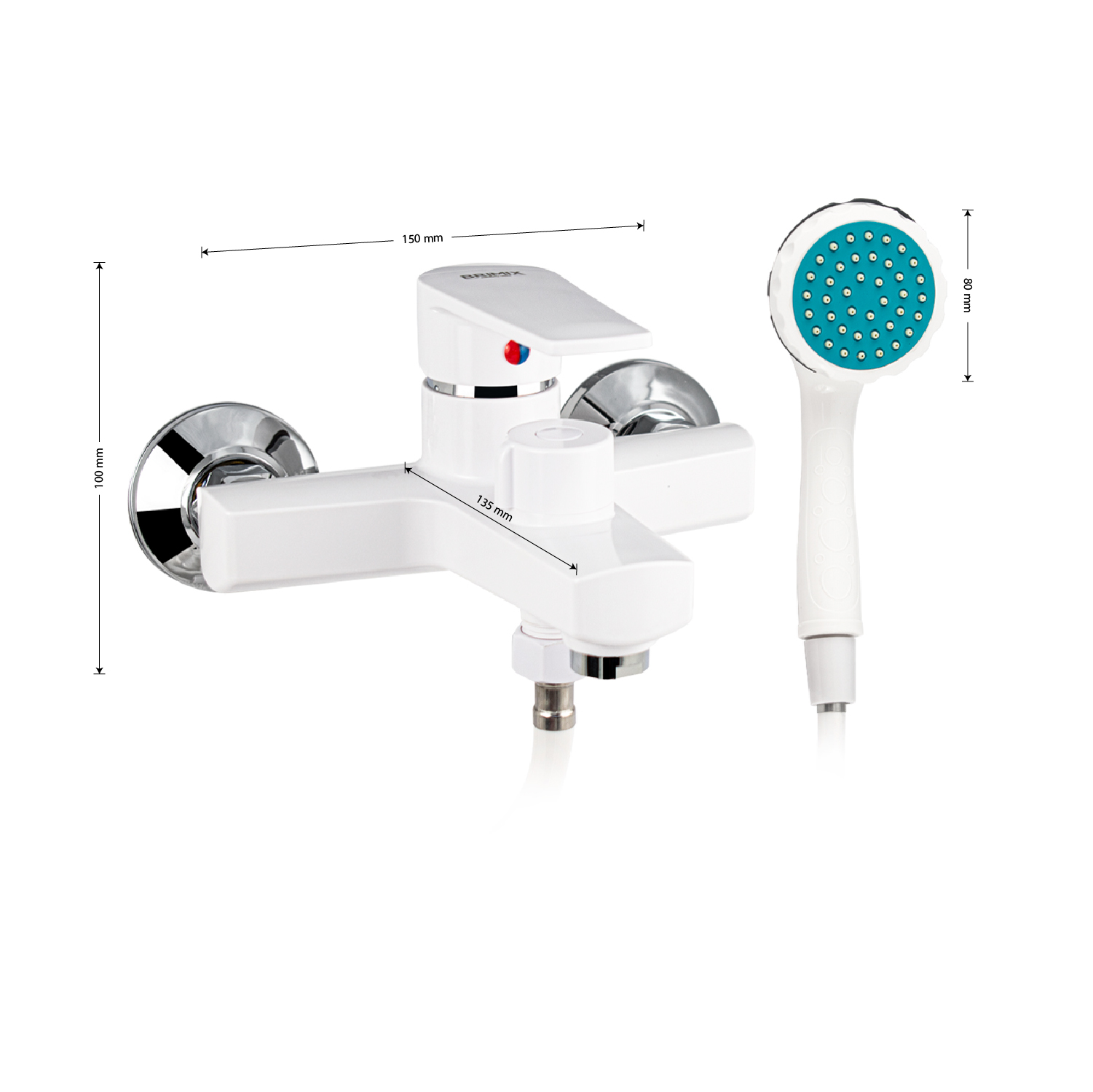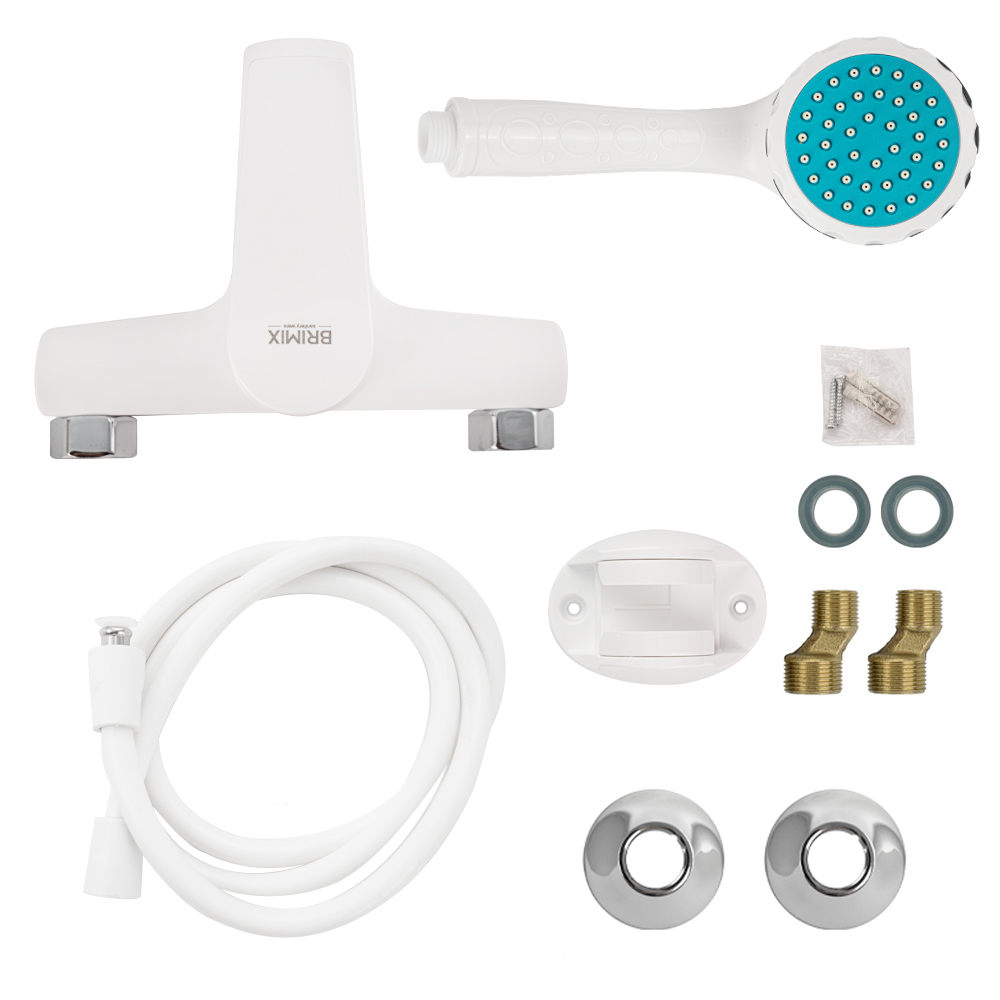 Смеситель из высокопрочного пластика АБС, БЕЛЫЙ в ванную / душевую комнату с коротким изливом, литой корпус, шаровый, с дивертором м/к на корпусе. Картридж d = 40 мм, литая ручка, хромированный аэратор для экономии воды, хромированные чашки и эксцентрики. Габаритные размеры: ширина 150 мм, высота корпуса 100 мм, длина излива 90 мм, душевая лейка d = 80 мм, шланг 150 см. Вес - 1,200 кг, объём - 0,00500 м3. В комплекте паспорт, корпус с изливом, дивертор, душевая лейка, шланг, кронштейн, комплект крепежа и прокладок.