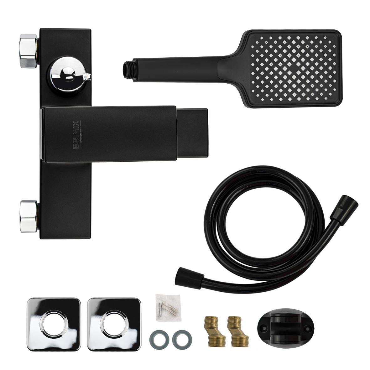 Смеситель из высокопрочного пластика АБС, ЧЕРНЫЙ в ванную / душевую комнату с коротким изливом, литой квадратный корпус, шаровый, с дивертором м/к на корпусе. Картридж d = 40 мм, литая ручка, хромированный аэратор для экономии воды, хромированные чашки и эксцентрики. Габаритные размеры: ширина 150 мм, высота корпуса 120 мм, длина излива 150 мм, душевая лейка 120*95 мм, шланг 150 см. Вес - 1.60 кг, объём - 0.00674 м3. В комплекте паспорт, корпус с изливом, дивертор, душевая лейка, шланг, кронштейн, комплект крепежа и прокладок.