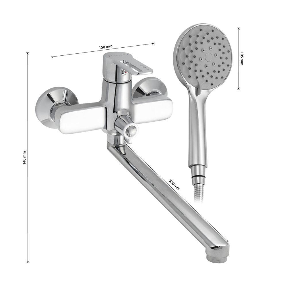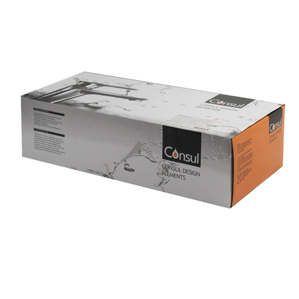 Смеситель хромированный в ванную / душевую комнату с длинным, плоским изливом, тяжёлый, массивный корпус, шаровый с дивертором м/к на корпусе. Материал изготовления — ЦАМ (цинк-алюминий-медь) + нержавеющая сталь. Картридж d = 35 мм, ручка с прорезью, аэратор для экономии воды, чашки и эксцентрики из нержавеющей стали. Габаритные размеры: ширина 150 мм, высота корпуса 140 мм, длина излива 330 мм, двухрежимная душевая лейка d = 105 мм, шланг 150 см. Вес - 1,900 кг, объём - 0,00740 м3. В комплекте паспорт, корпус с изливом, дивертор, душевая лейка, шланг, кронштейн, комплект крепежа и прокладок. Габаритные размеры коробки: ширина 395 мм, высота 105 мм, глубина 170 мм.