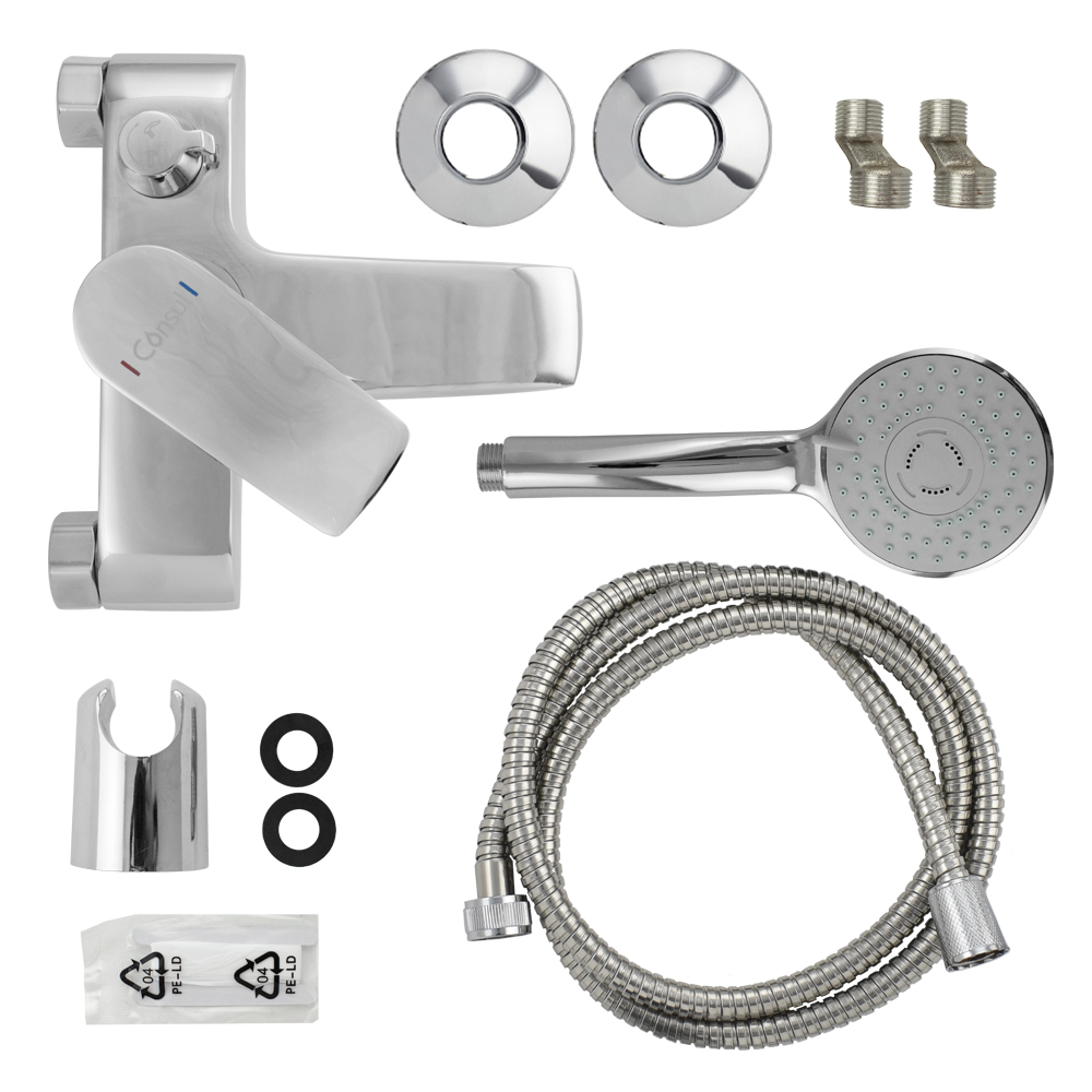Смеситель в ванную / душевую комнату, хромированный, с коротким изливом, литой корпус, шаровый, с поворотным дивертором м/к на корпусе. Материал изготовления — ЦАМ (цинк-алюминий-медь). Картридж d = 35 мм, литая ручка, аэратор для экономии воды, чашки и эксцентрики из нержавеющей стали. Габаритные размеры: ширина 150 мм, высота корпуса 110 мм, длина излива 110 мм, круглая трёхрежимная душевая лейка d = 90 мм, шланг 150 см. Вес - 2,100 кг, объём - 0,00630 м3. В комплекте паспорт, корпус с изливом, дивертор, душевая лейка, шланг, кронштейн, комплект крепежа и прокладок.