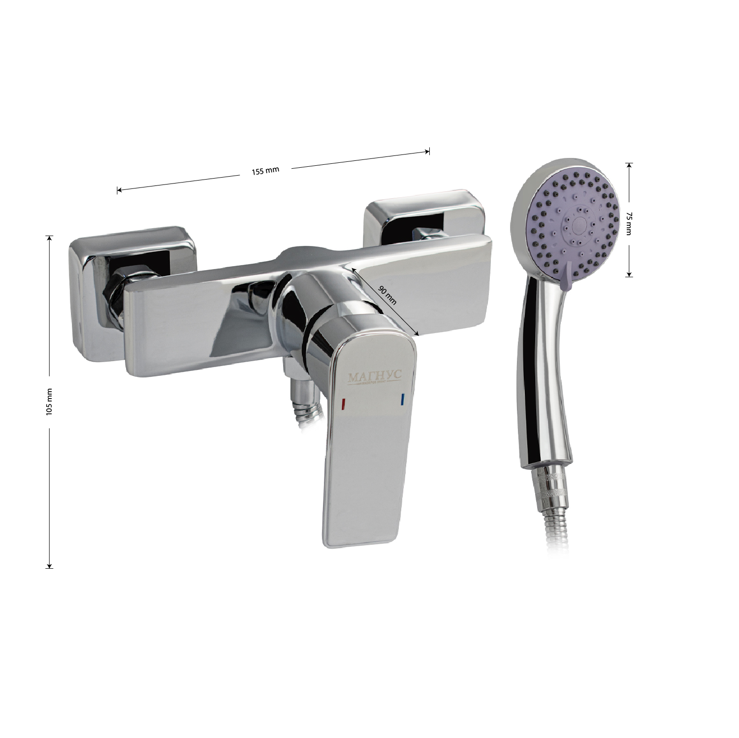 Смеситель хромированный в ванную / душевую комнату без излива, литой корпус, шаровый. Материал изготовления — ЦАМ (цинк-алюминий-медь), Картридж d = 35 мм, литая ручка, чашки и эксцентрики. Габаритные размеры: ширина 150 мм, высота корпуса 105 мм, глубина 90 мм, двухрежимная душевая лейка d = 75 мм, шланг 150 см. Вес - 1.500 кг, объём - 0,00425 м3. В комплекте паспорт, корпус, душевая лейка, шланг, кронштейн, комплект крепежа и прокладок.