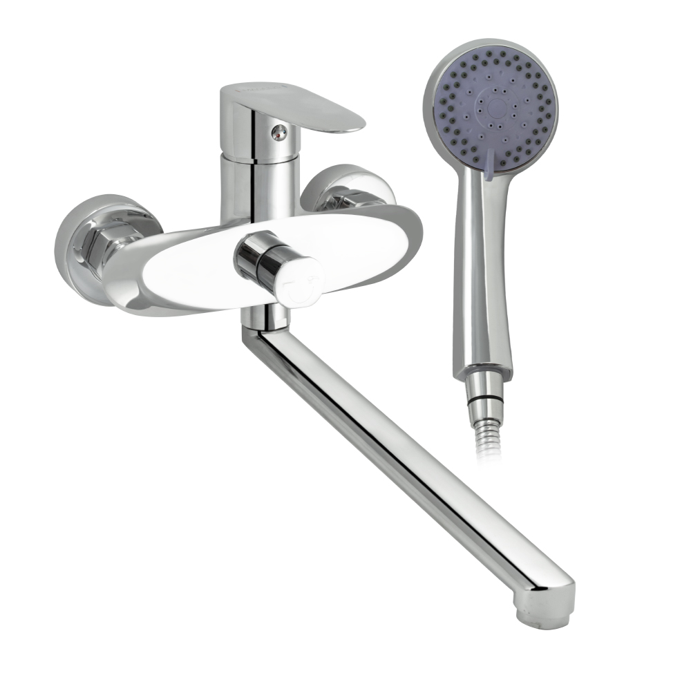 Смеситель в ванную / душевую комнату, латунный корпус, хромированный, с длинным плоским изливом, шаровый с дивертором м/к на корпусе. Картридж d = 35 мм, литая ручка, аэратор для экономии воды, чашки и эксцентрики. Габаритные размеры: ширина 150 мм, высота корпуса 150 мм, длина излива 330 мм, круглая трёхрежимная душевая лейка d = 75 мм, шланг 150 см. Вес - 2,200 кг, объём - 0,00864 м3. В комплекте паспорт, корпус с изливом, дивертор, душевая лейка, шланг, кронштейн, комплект крепежа и прокладок.
