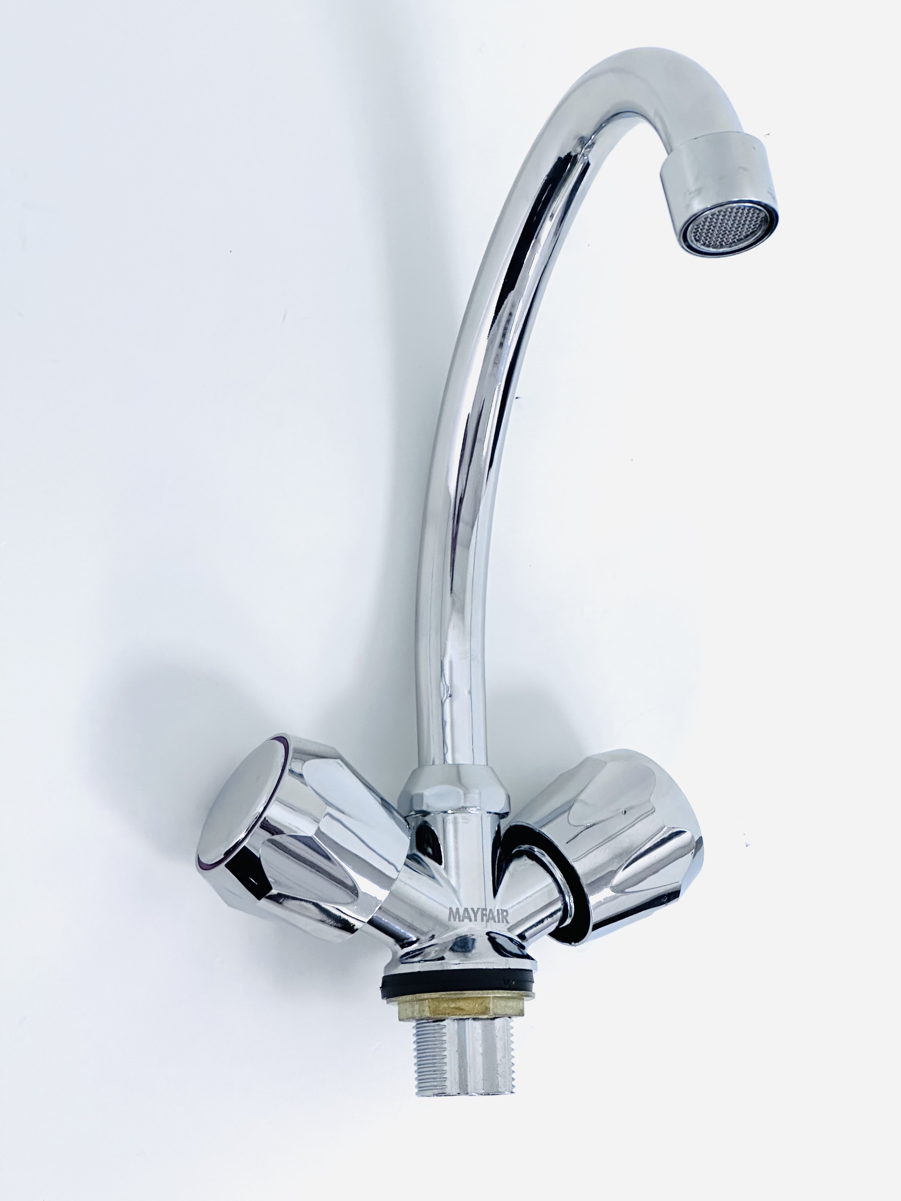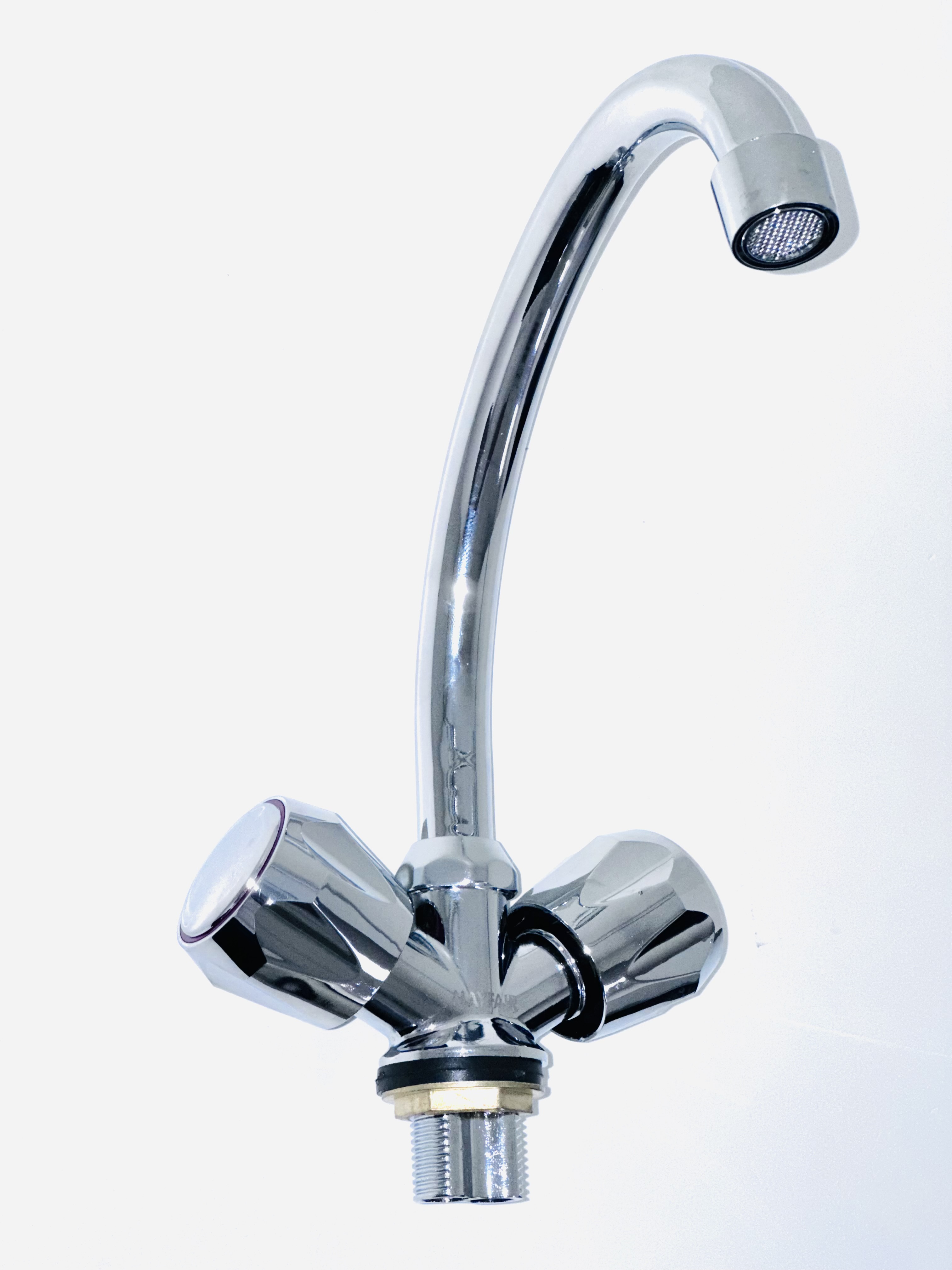 Смеситель для кухонной мойки, хромированный, с высоким изливом. Материал изготовления — ЦАМ (цинк-алюминий-медь) + нержавеющая сталь. Крепление резьба - гайка. Аэратор для экономии воды. Кранбукса м/к 1/2, ручка крест, поворот на 90˚. Габаритные размеры: высота  мм, длина  мм, диаметр посадочного седла  мм, длина резьбы  мм, длина подводки  мм. Вес -  кг, объём -  м3. В комплекте паспорт, корпус с изливом, подводка 1/2, крепеж, набор прокладок.