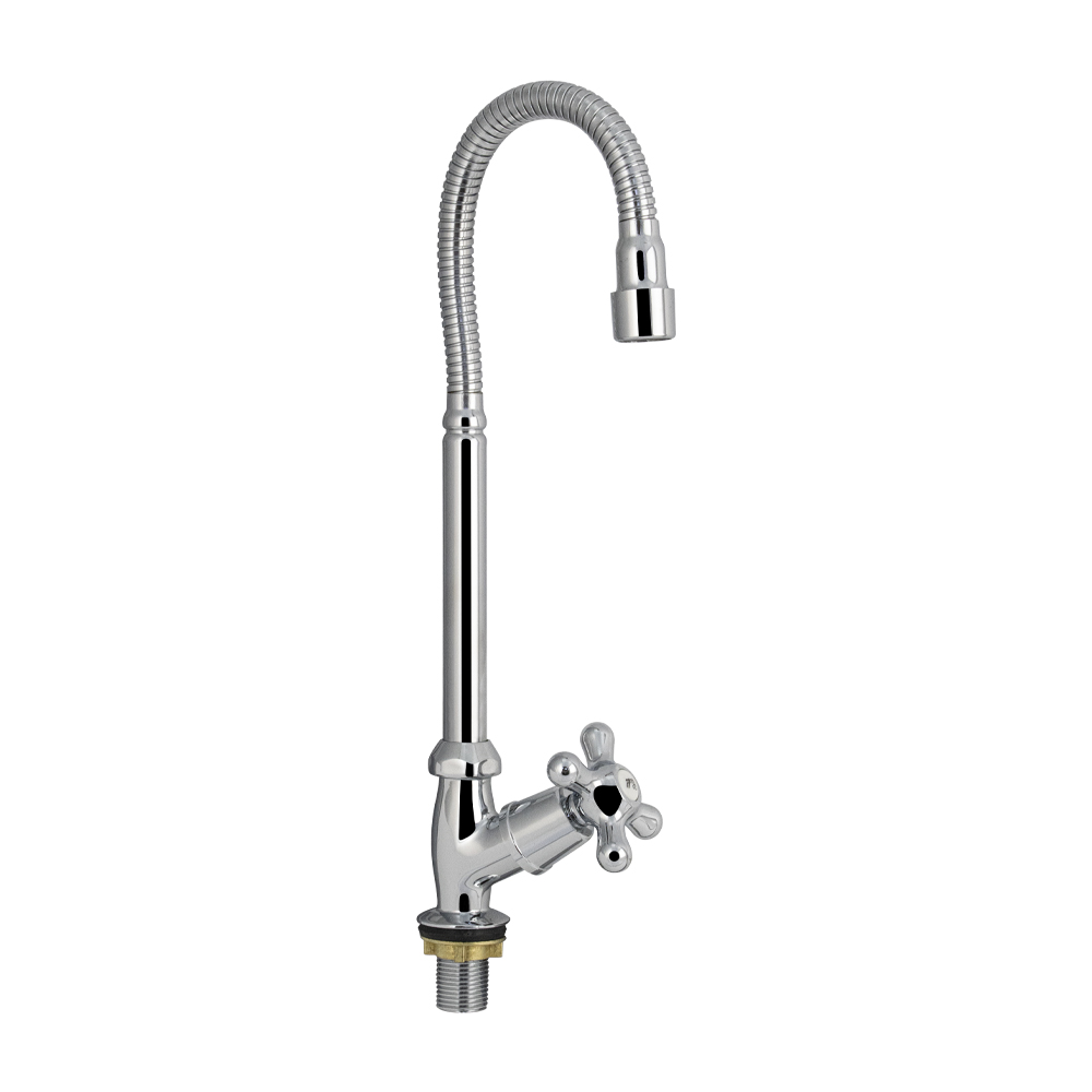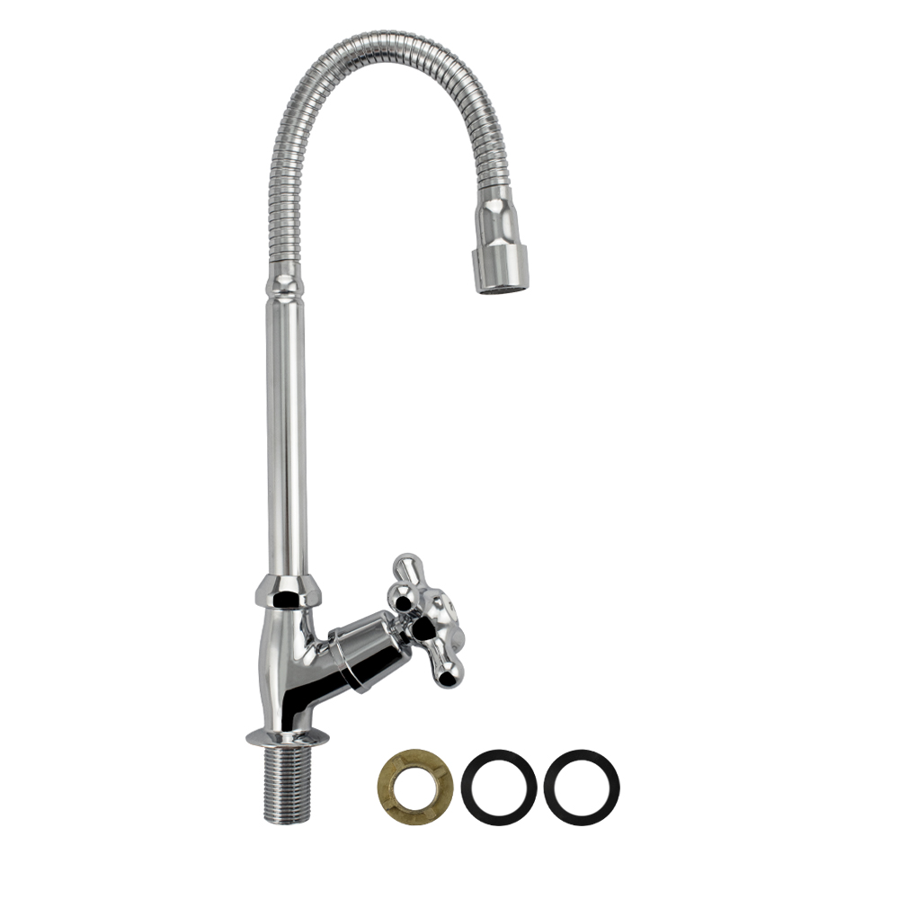 Кран на одну воду хромированный с гибким изливом. Крепление резьба - гайка. Кранбукса м/к, ручка крест поворот на 90˚. Габаритные размеры: высота 300-350 мм, регулировка расположения излива от 130-180 мм , диаметр посадочного седла 35 мм, длина резьбы 35 мм. Вес - 1,100 кг, объём - 0,00187 м3. В комплекте корпус, крепёж