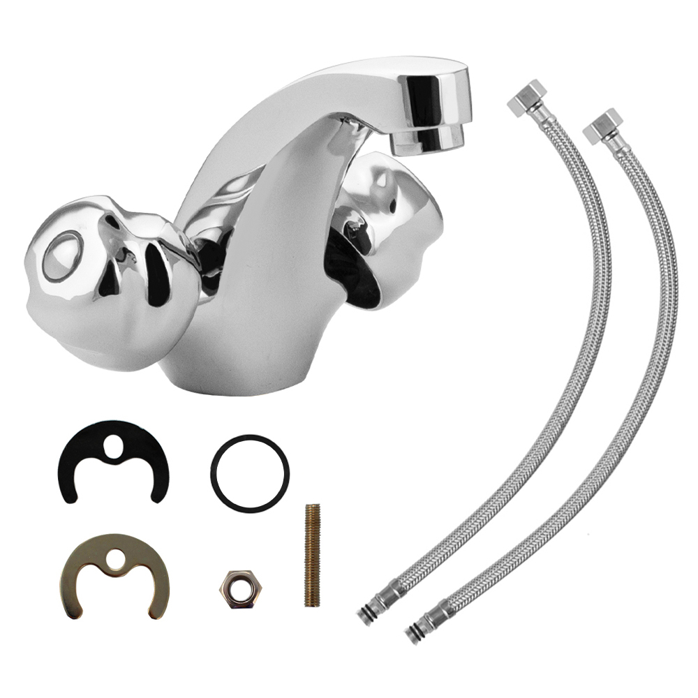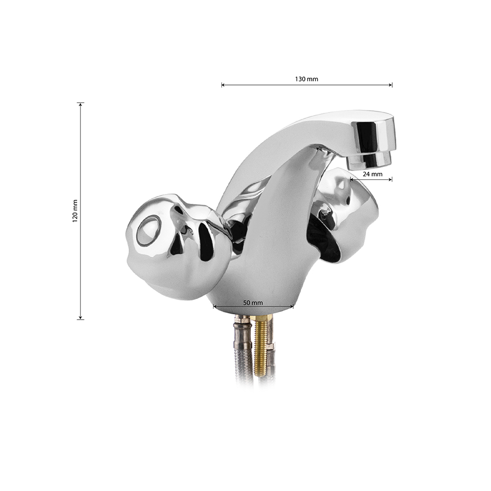 Смеситель для раковины, хромированный, с коротким литым изливом, литой массивный корпус. Материал изготовления — ЦАМ (цинк-алюминий-медь) + нержавеющая сталь. Крепление на шпильке. Кранбукса м/к, ручка круглая, поворот на 90˚. Аэратор для экономии воды. Габаритные размеры: высота 120 мм, длина излива 130 мм, диаметр посадочного седла 50 мм, длина подводки 300 мм. Вес - 1,100 кг, объём - 0,00292 м3. В комплекте паспорт, корпус, подводка 1/2, крепеж, набор прокладок.
